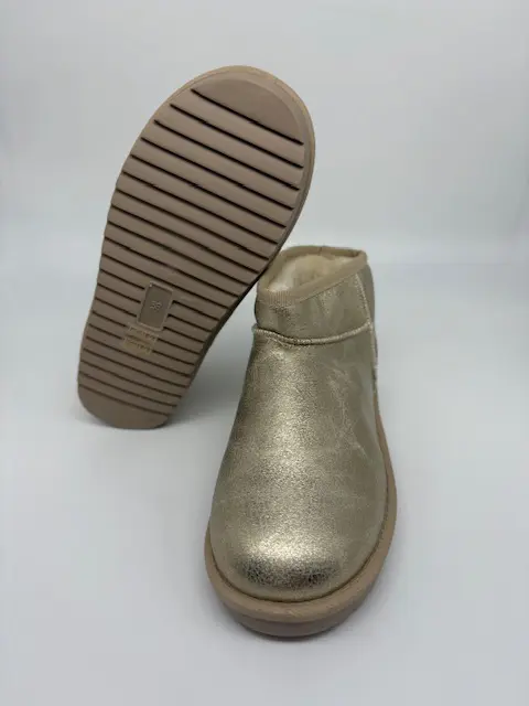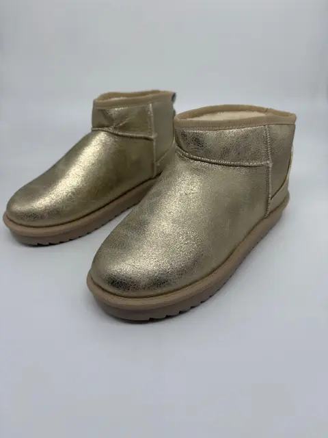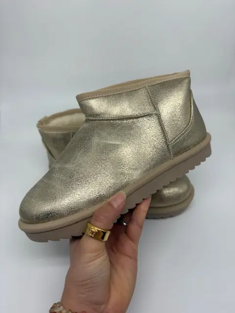 Add a touch of glam to your look with these mini gold boots. Comfort, warmth, style all in one. Great for those running errands days
