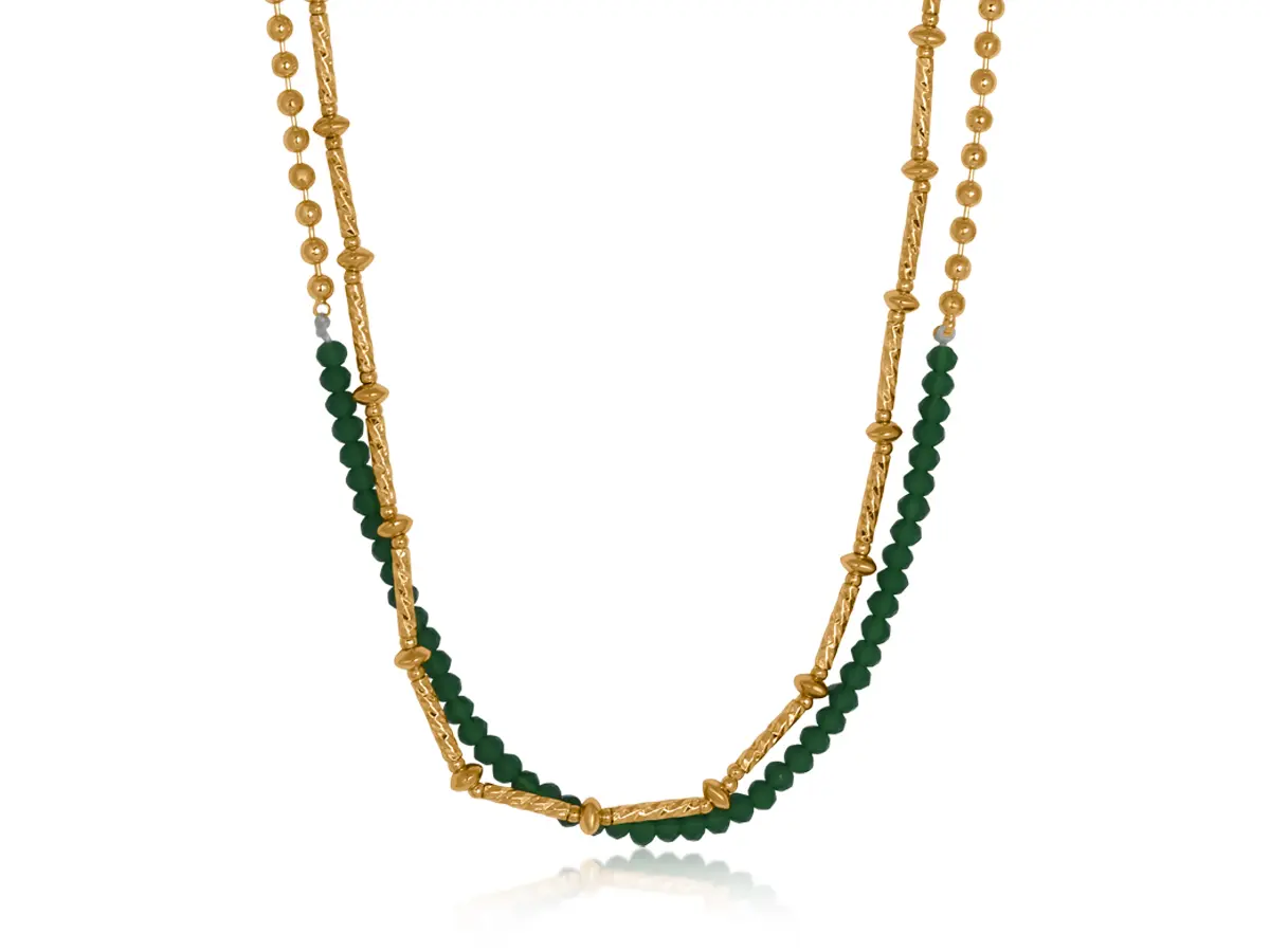 This handcrafted two-chain necklace features one chain with colorful glass stones and the other with textured detailing, creating a dynamic and eye-catching design. A stylish and versatile piece that adds a modern touch to any outfit. At least 50% of the brass used in the jewellery we make is recycled from leftover/overhead brass.