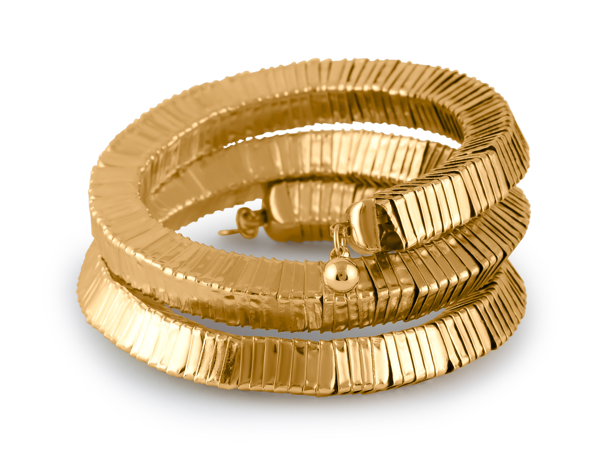 Handcrafted in gold or silver plating, this striking wrap-around bracelet combines a high-shine finish with a modern, bold design. An accessory that adds a contemporary and edgy touch to any outfit. Could be used as a bracelet or arm cuff