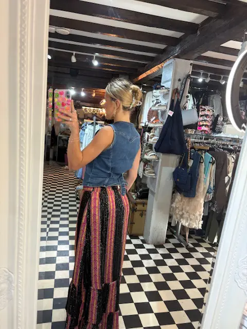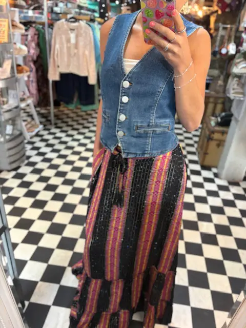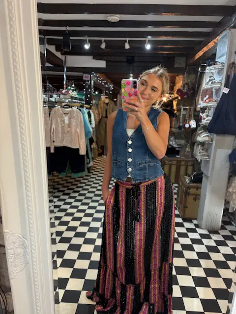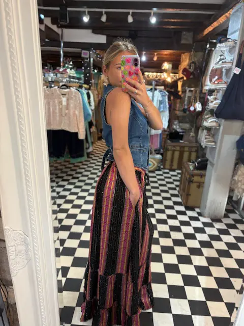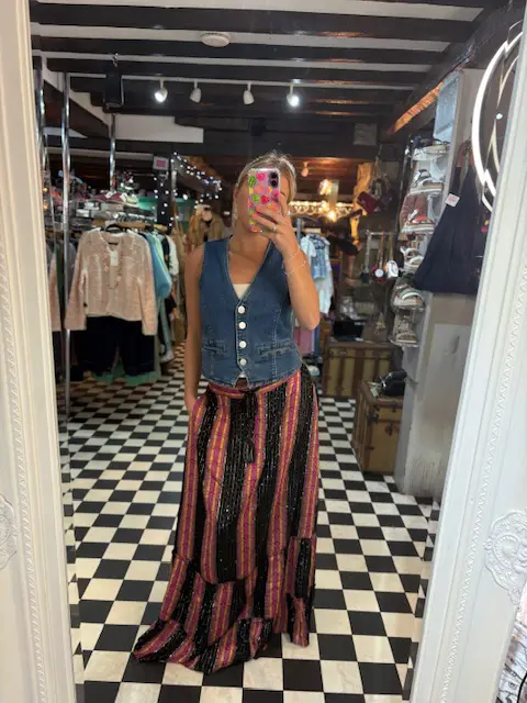 Lovely new boho vibe maxi skirt features little pops of colour with its yellow, orange, pink and purple stripes along with tiny touches of sparkle with its sequins scattered on the black areas.
