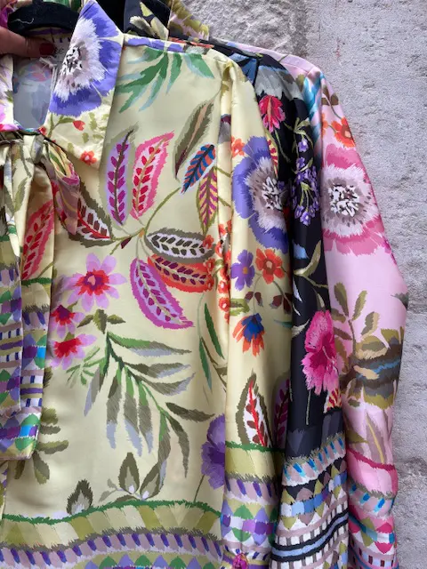 These beautiful silky floral blouse tops feature a bow tie around the neck. Very cute, can be dressed up or down and come in a mix of fun colours.