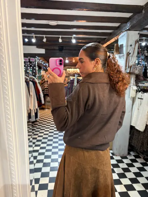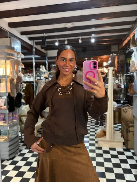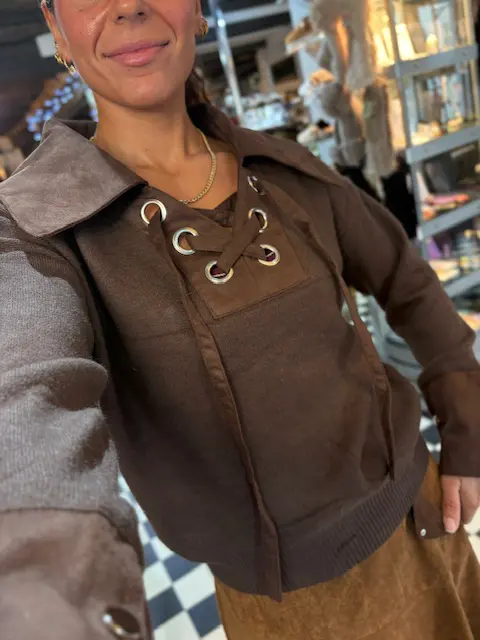 Brown Knit Top with Faux Suede Collar