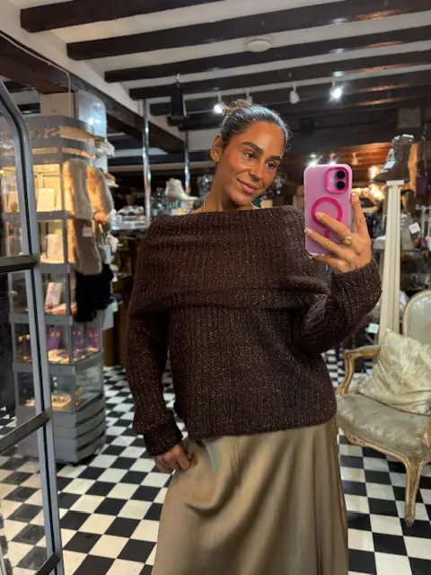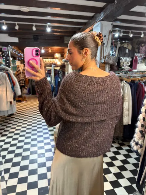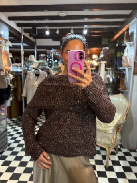 This gorgeous rich chocolate brown off the shoulder Bardot style jumper has little strings of silver sparkling string flowing throughout and all over. Can be dressed up or down. Keeps you warm and stylish. Very easy and comfortable to wear.
