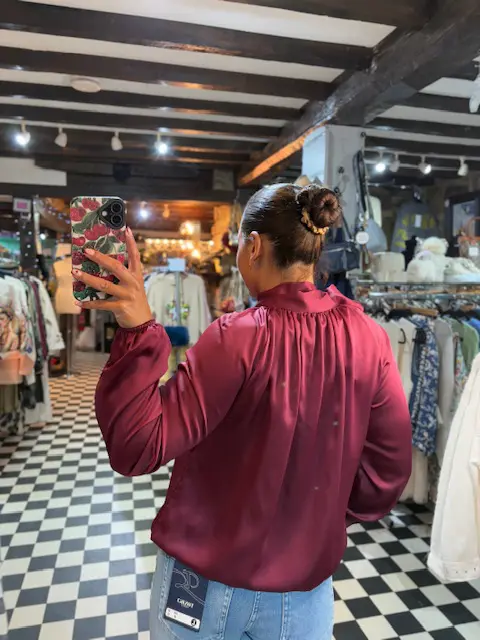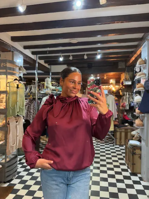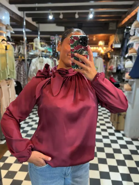 Gorgeous burgundy colour in this satin style blouse. Perfect for work, events and occasions. This shirt features an asymmetric bow tie detail around the neckline and an Elasticated waist and cuffs on the sleeves.