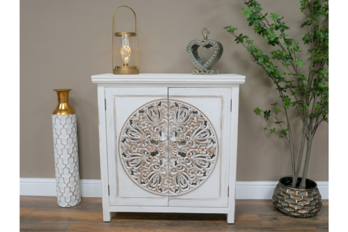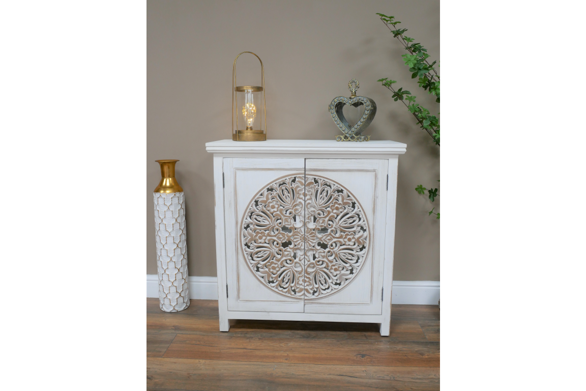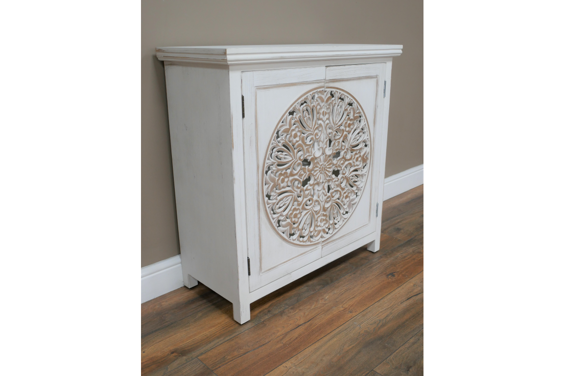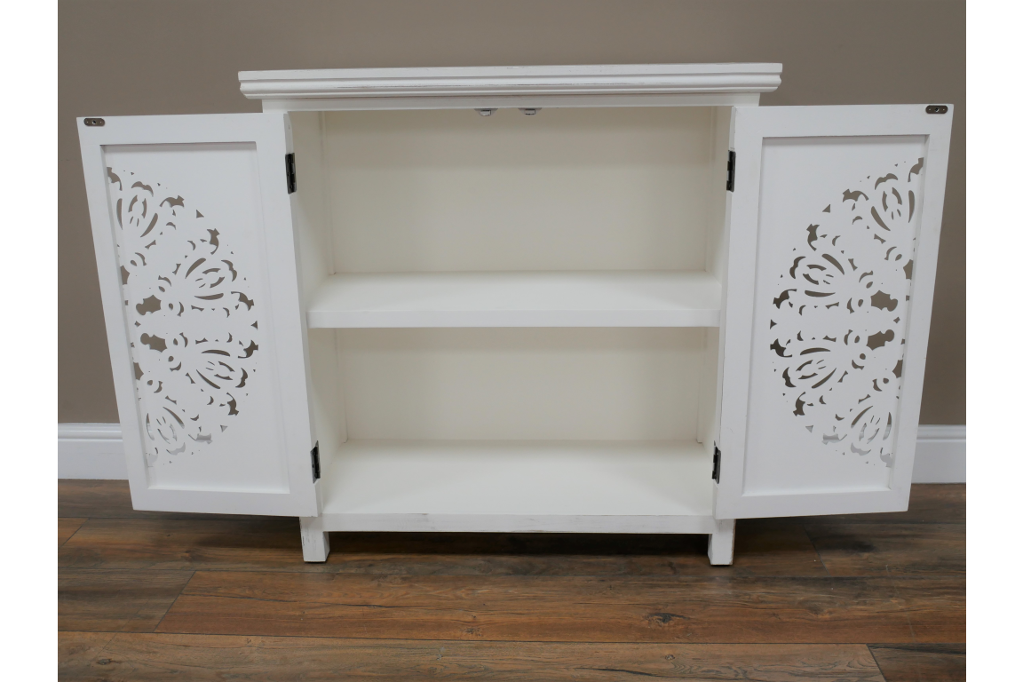 Lovely addition to any home, this white painted craved cabinet.