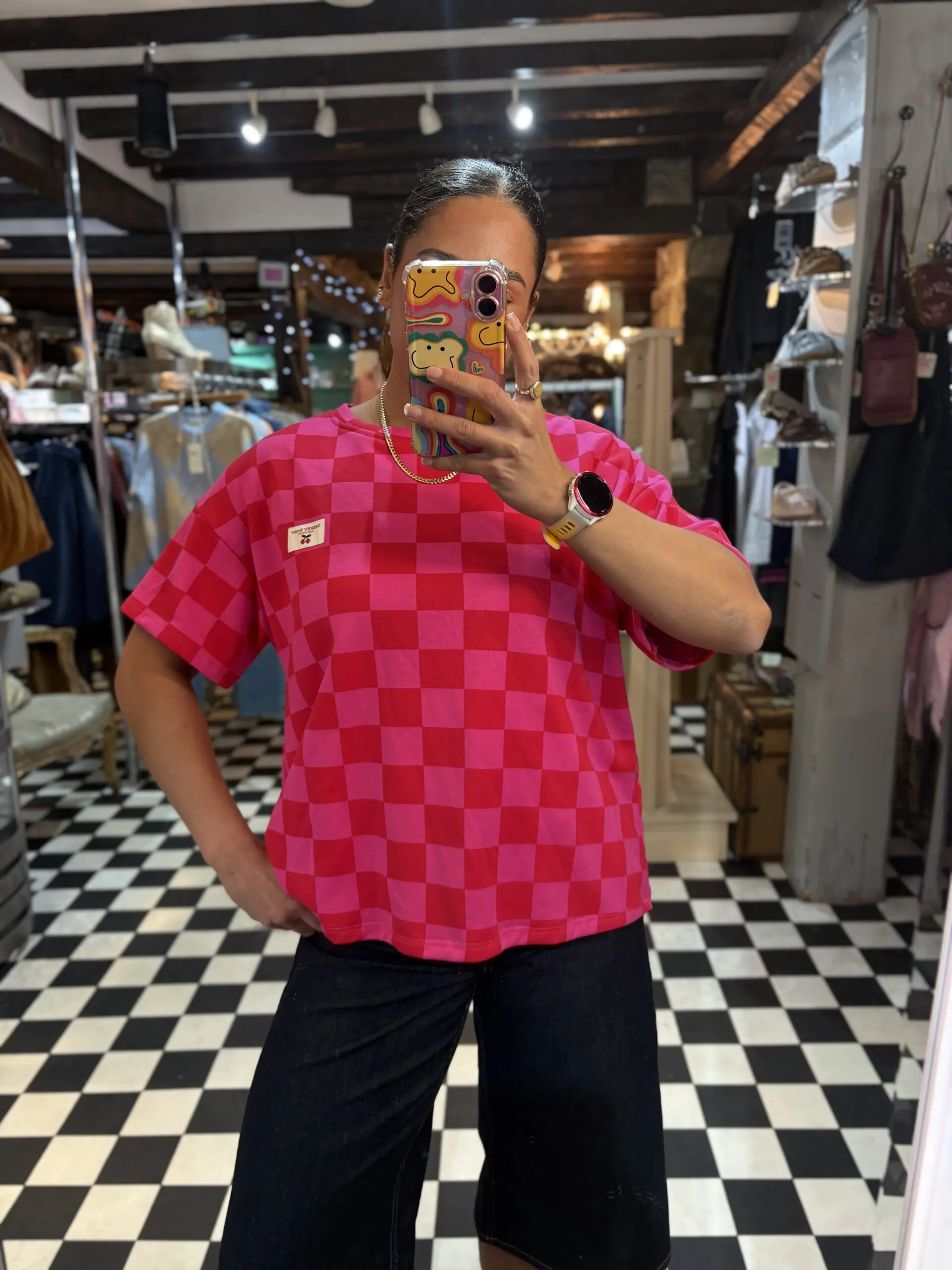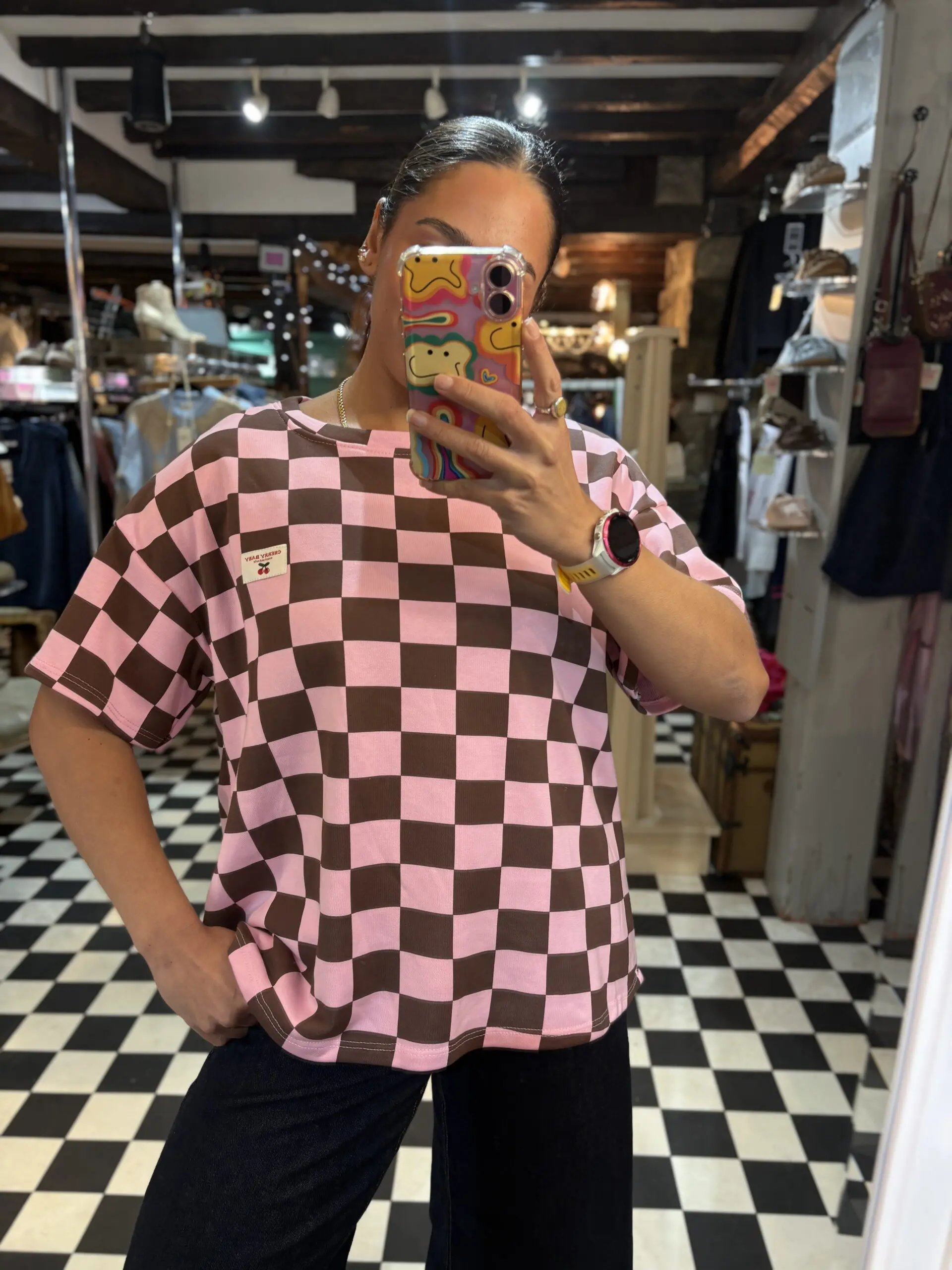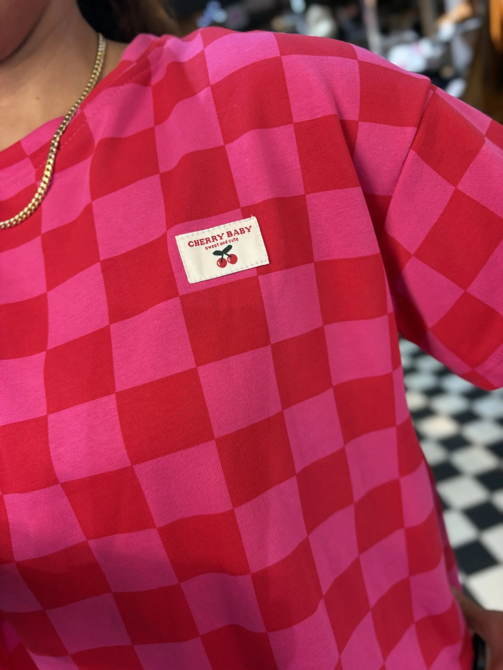 Cute new check print sweatshirt style t shirt features little cherry baby patch on the front. Super comfy and easy to wear. Love both the colourways of this.