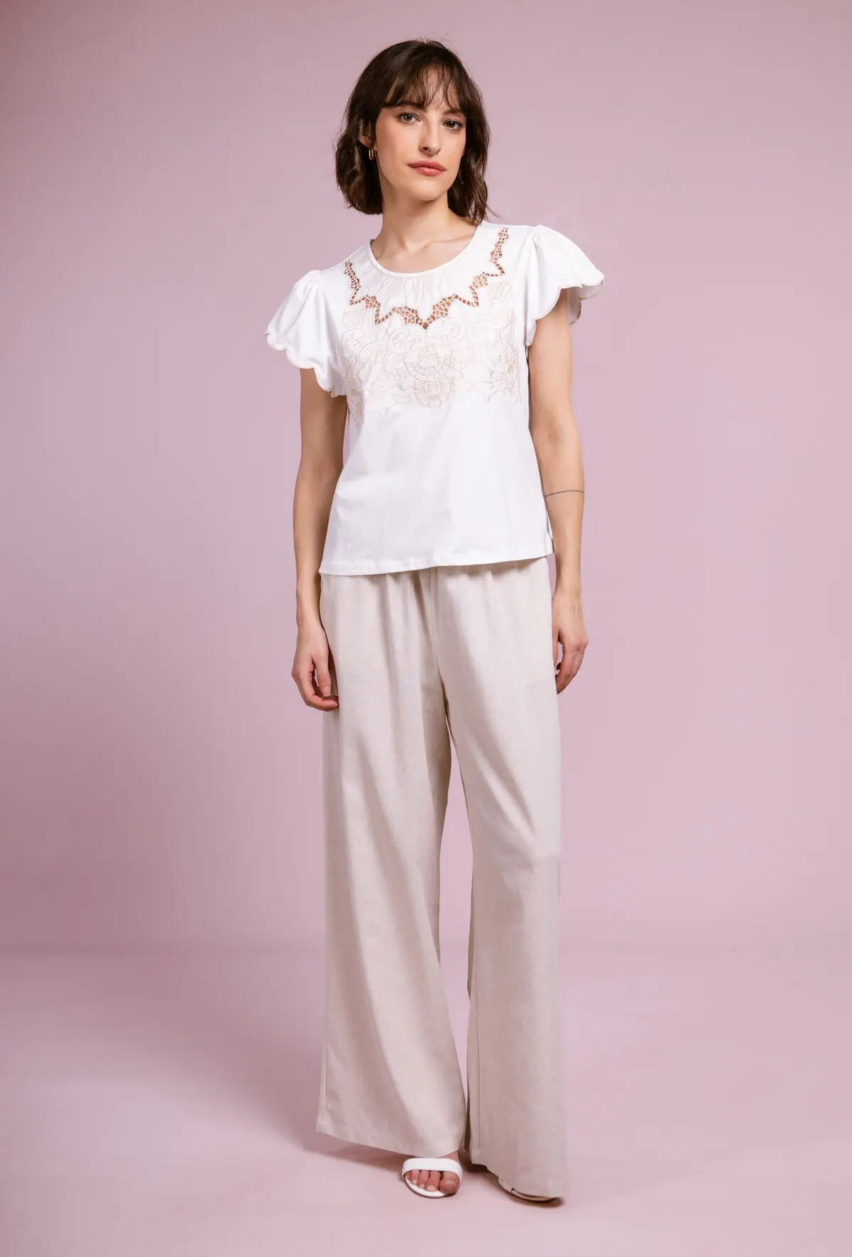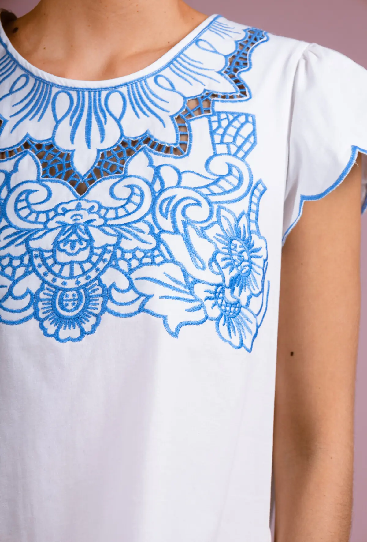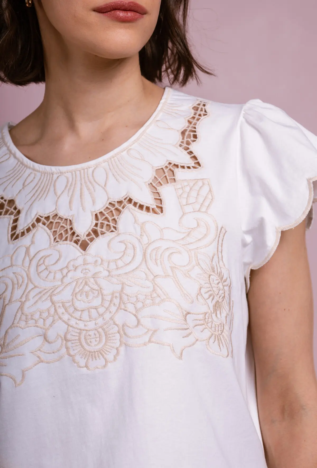 Bring a touch of delicacy and elegance to your wardrobe with our LIZ model t-shirt top. This white t-shirt is distinguished by its short sleeves decorated with flywheels, adding a feminine and light note. The central element of this t-shirt is the complex embroidery that adorns the front, around the neck and descending down. The embroidery is white, melting harmoniously with the t-shirt fabric, creating a subtle and refined effect. The light and breathable fabric is perfect for spring and summer days, offering comfort and style. Whether for a relaxed outfit or to bring a chic note to your daily style, the Liz t-shirt is an essential in your collection.