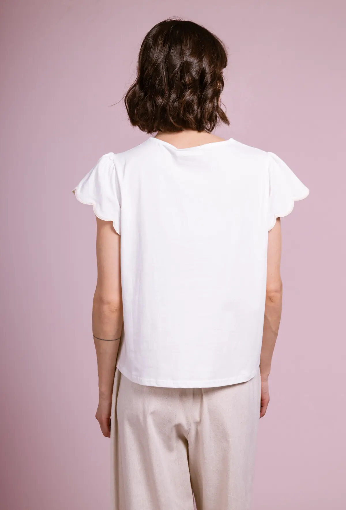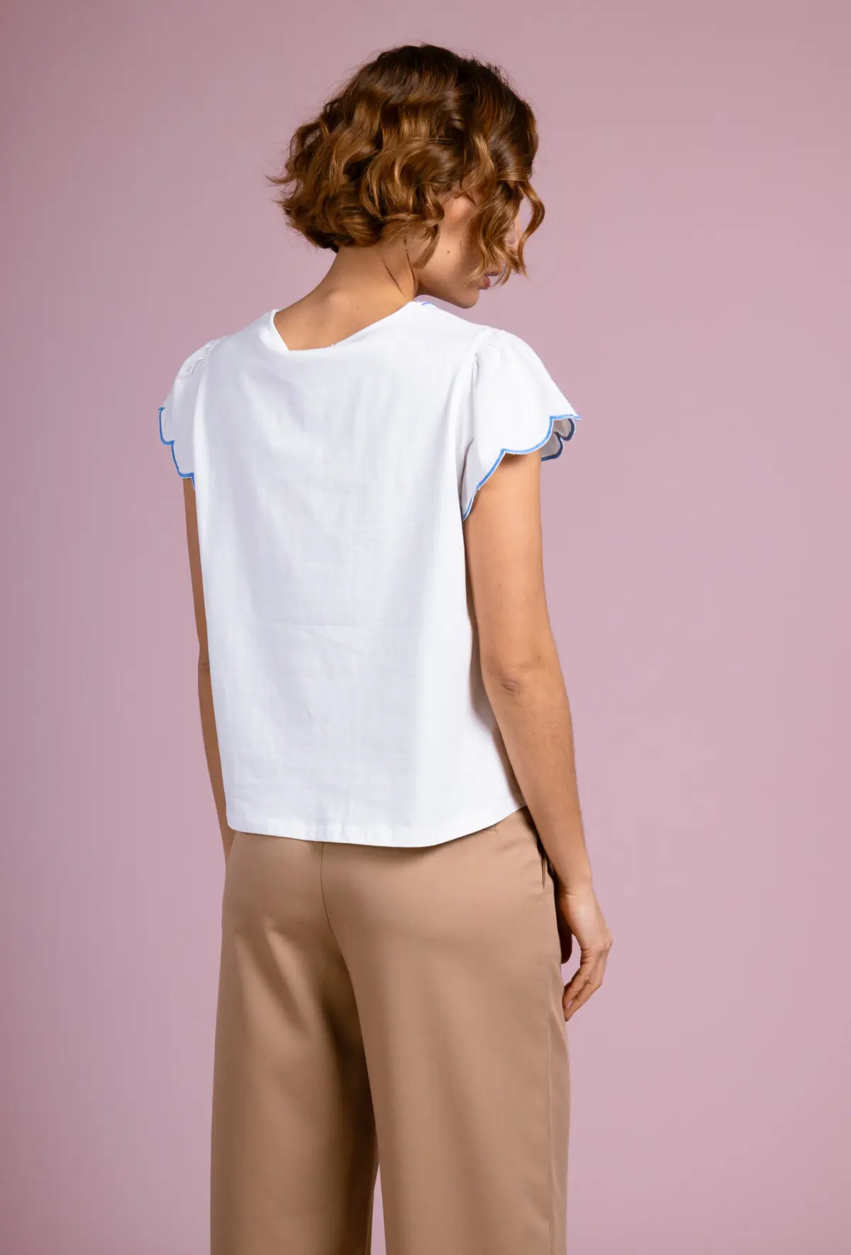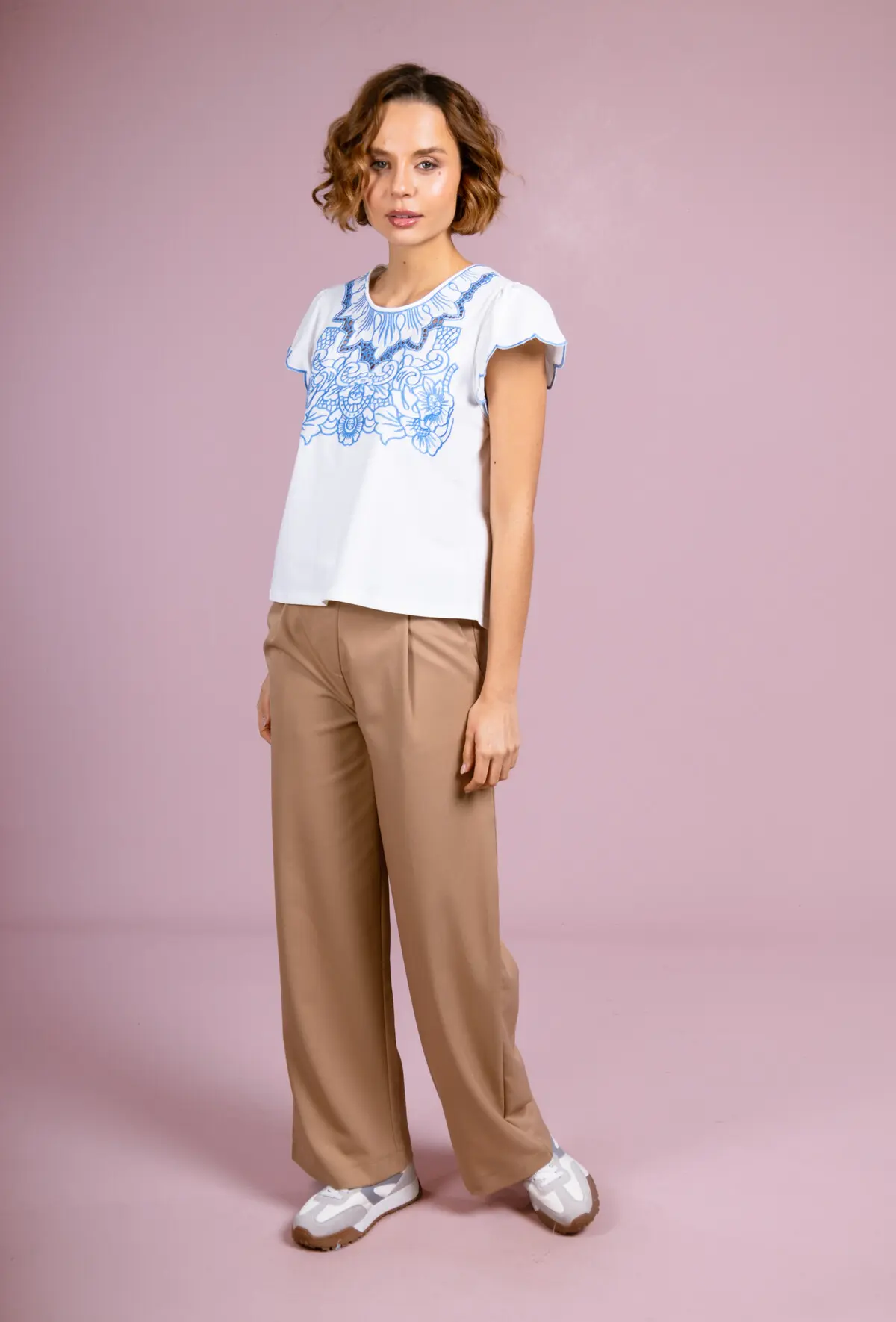 Bring a touch of delicacy and elegance to your wardrobe with our LIZ model t-shirt top. This white t-shirt is distinguished by its short sleeves decorated with flywheels, adding a feminine and light note. The central element of this t-shirt is the complex embroidery that adorns the front, around the neck and descending down. The embroidery is white, melting harmoniously with the t-shirt fabric, creating a subtle and refined effect. The light and breathable fabric is perfect for spring and summer days, offering comfort and style. Whether for a relaxed outfit or to bring a chic note to your daily style, the Liz t-shirt is an essential in your collection.
