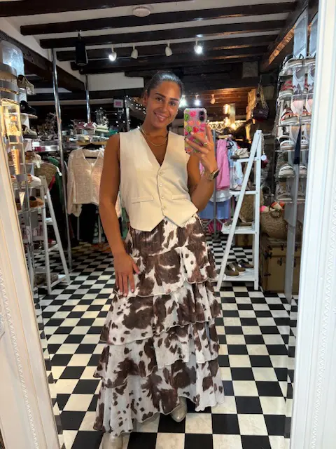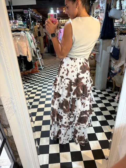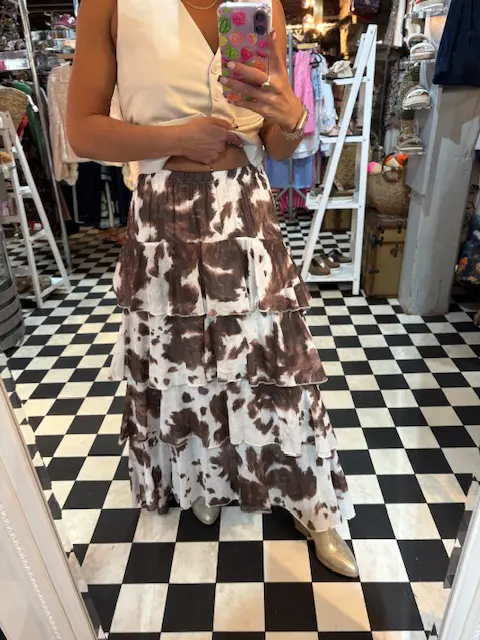 Hop right onto this years trend with this amazing frill cow print maxi skirt. Can be dressed up or down.