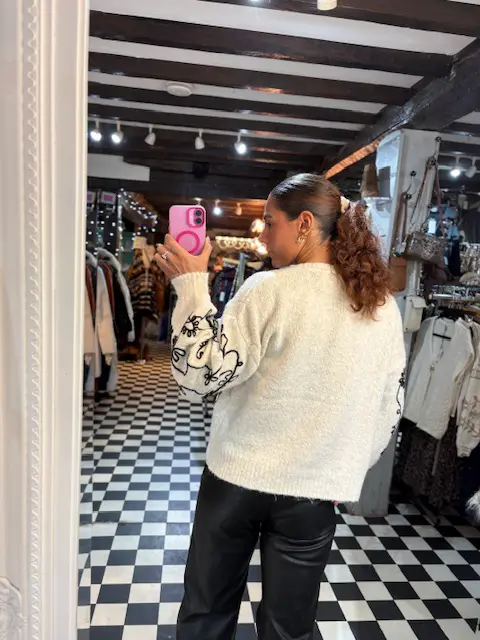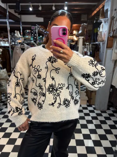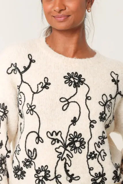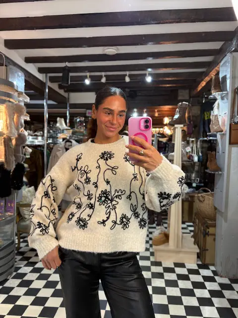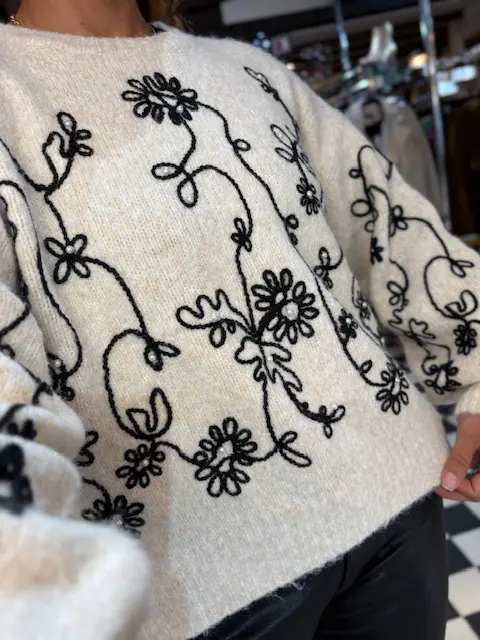Beautiful cream and black embroidered jumper features a few pearls dotted on the front within its pattern. Soft, cosy and comfortable to wear.