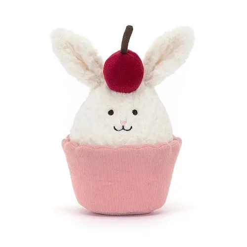 The Dainty Dessert Bunny Cupcake is gorgeously mixed-up. Inside that pink fine cord cake case there’s a soft cream bunny masquerading as a treat! This long-eared bunny has textured fur and wears a bold cherry hat. There’s even a bobtail peeping out! A cute gift with kawaii charm.