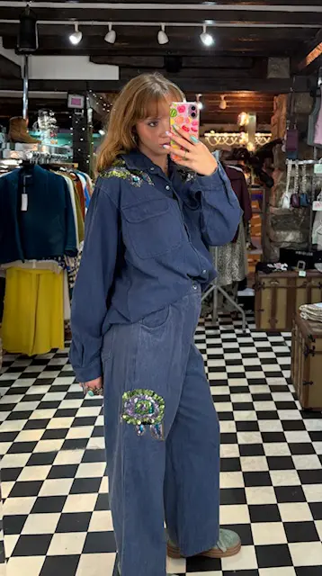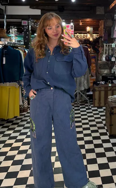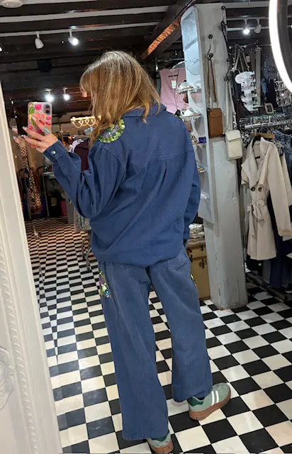 Obsessed with this denim co ord 2 piece trouser and shirt set. Oversized slouchy style, a total winter but still grasping onto summer vibe. Can be worn together or separately and styled in so many ways. We love the colours on this. Super comfy, nice and thick denim. Totally unique.