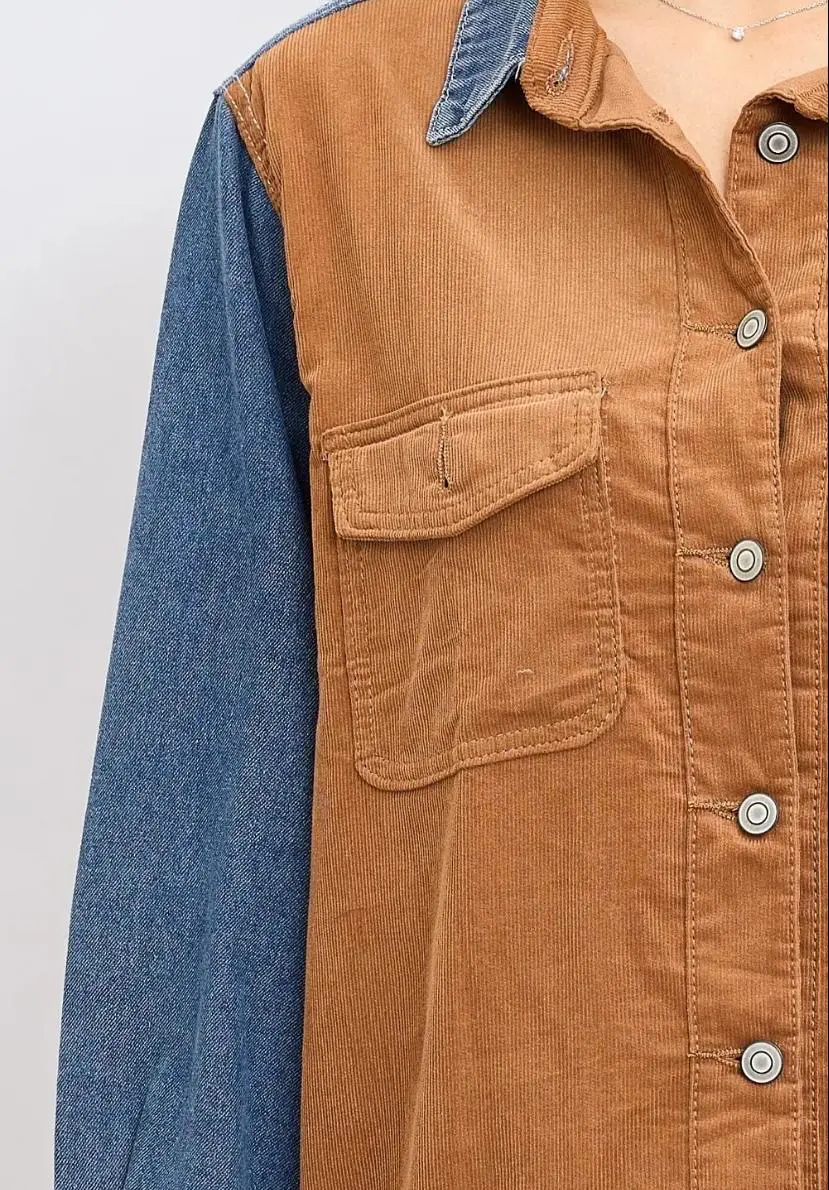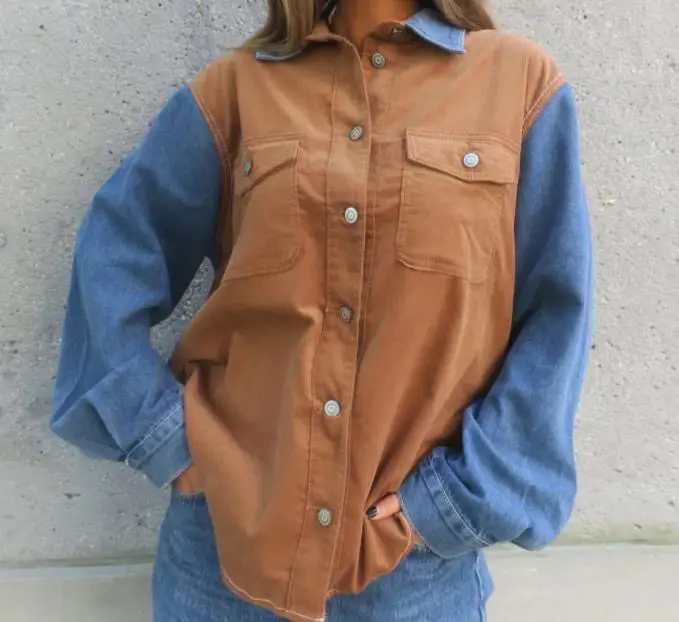 This Denim shirt features a lovely tan patchwork material style, giving it a unique look whilst pairing together that autumnal vibe. Can be layered or worn as a light over jacket.