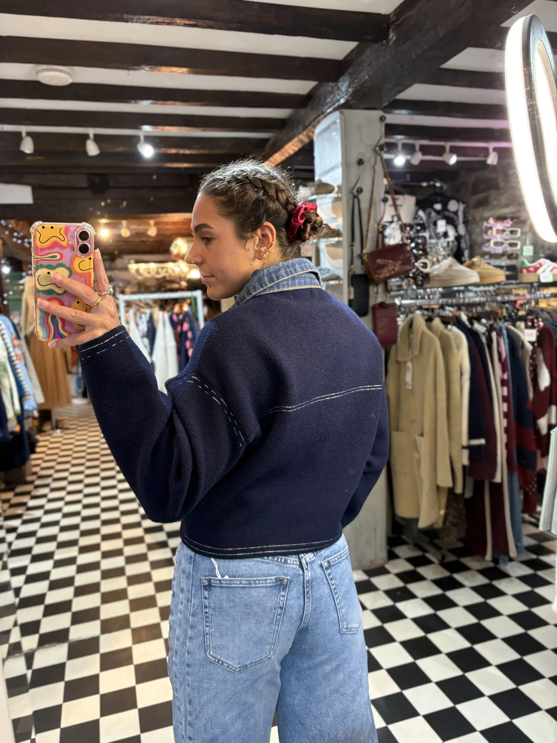 Lovely navy knit and denim mixed jacket. Love this worn on its own done up or open and layered. Comfy, warm, stylish.