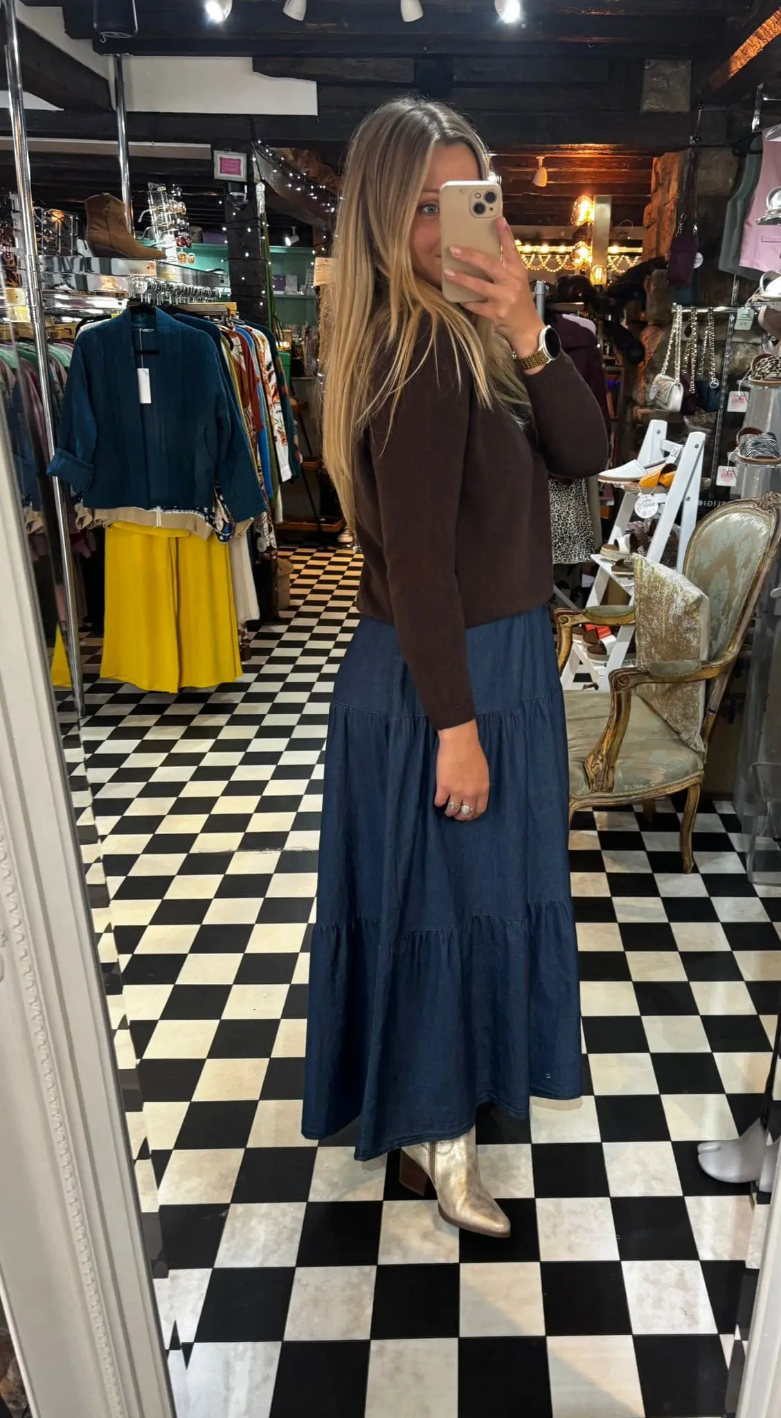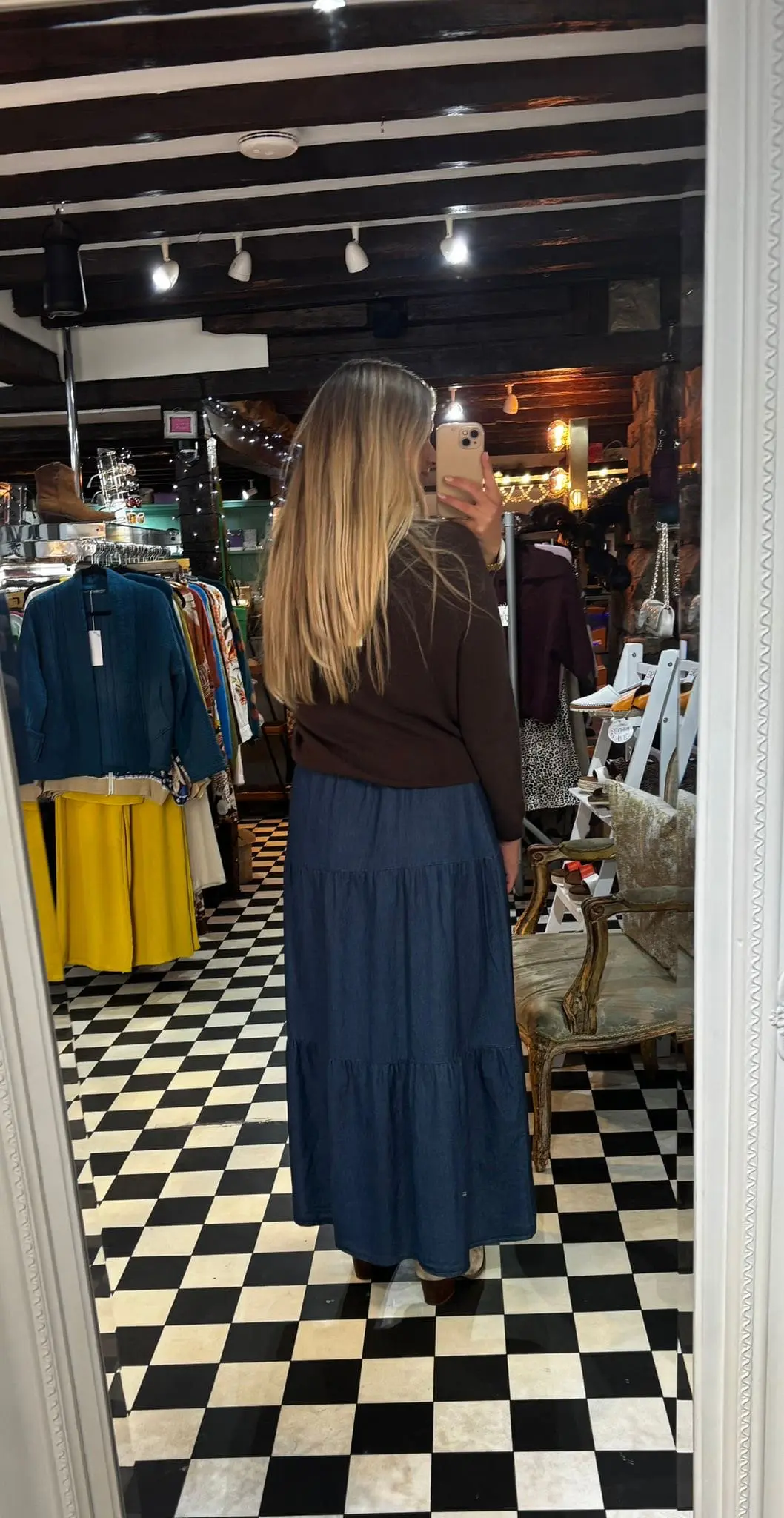 Lovely and long denim style tier maxi skirt. Features an Elasticated waist for a comfortable and secure fit. Looks amazing with boots or trainers.