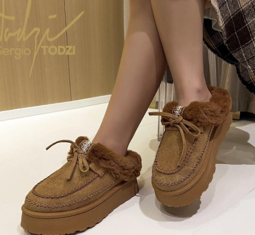 Designer inspired faux fur slippers. A newer style to the market which are so popular! Triangular stitch detailing which adds a pop of neutral colour.