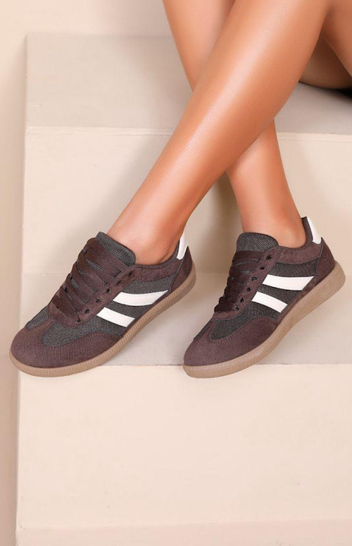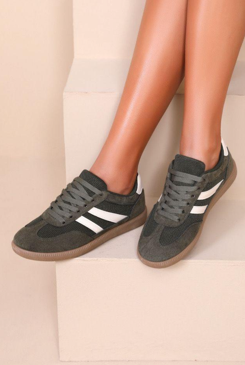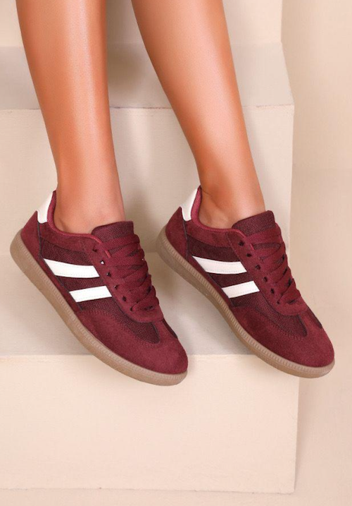 Designer inspired trainers with gumsole and white stripe detail. Available in green, brown and wine red.