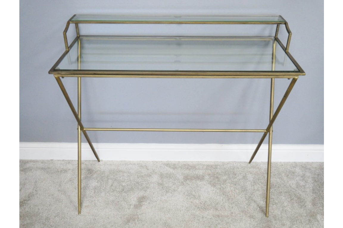 Beautiful addition to any home, this glass, metal desk. A brass finish could also be used as a dressing table.