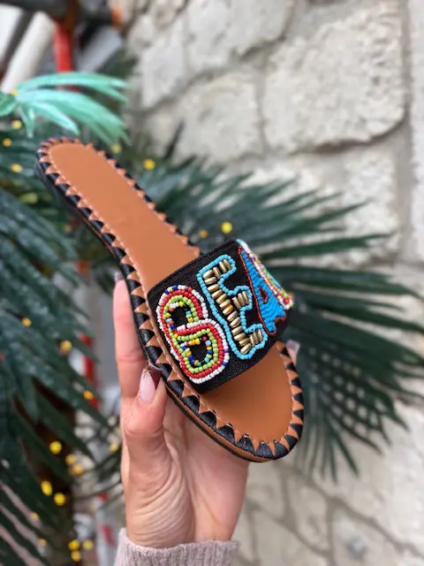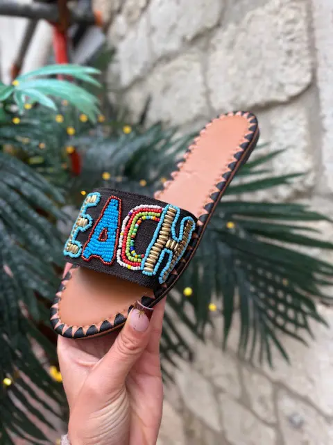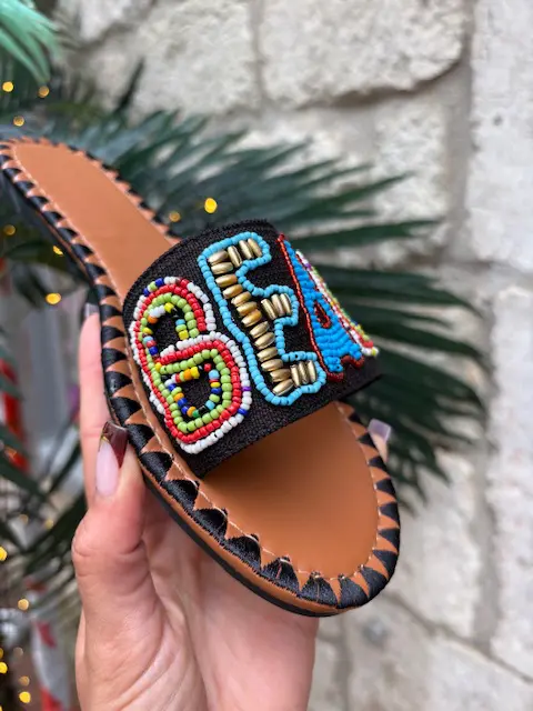 These beautiful new summer slider sandals feature a beaded and embellished ‘beach’ slogan across the front. Easy and comfortable to wear. Add some fun to your summer looks with these!