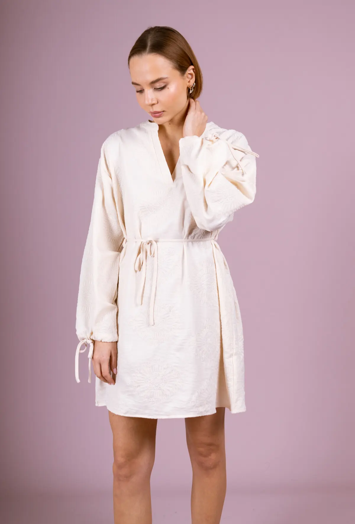 Bring a touch of bohemian charm to your wardrobe with our Belinda model dress. Available in two colors, blue and cream, this dress is decorated with white circular and diamond patterns, creating an elegant and refined contrast. With its long sleeves and V-neck, it combines comfort and sophistication. Perfect for spring and summer days, this light and flowing dress will ensure you look chic and relaxed. Whether for a stroll around town or a night out with friends, this dress will be a versatile and must-have addition to your collection.