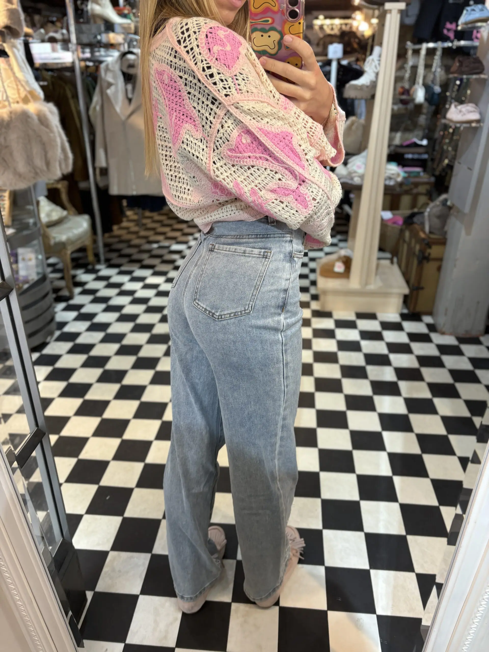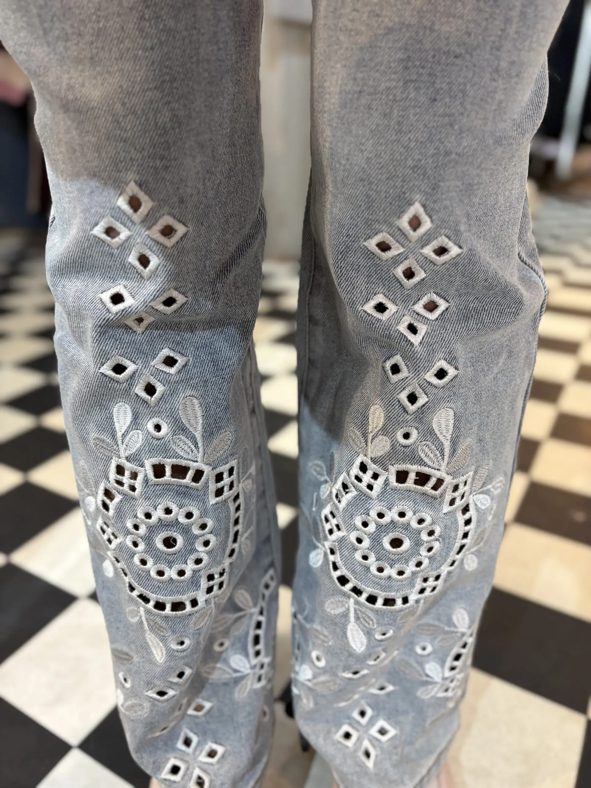 Lovely light denim straight leg style jeans feature an amazing open embroidered detail on the bottoms. Comfortable fit with a bit of stretch.