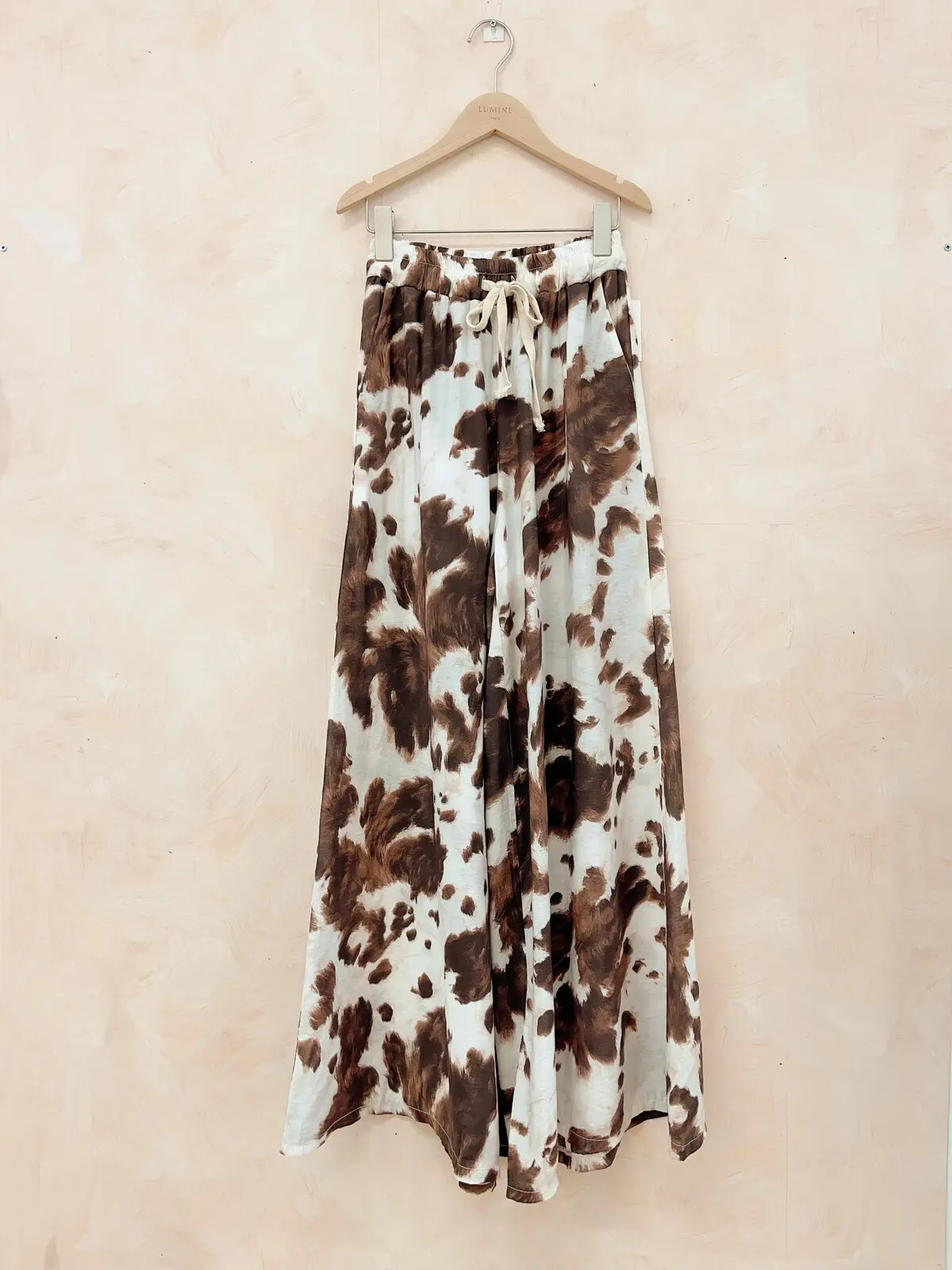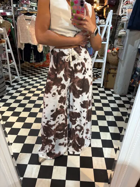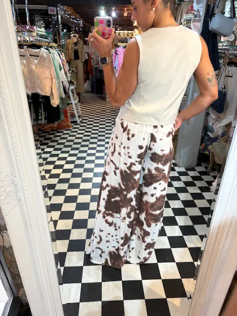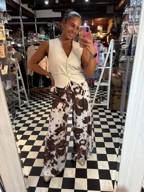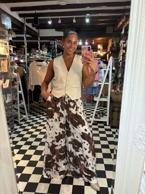 These incredible cow print trousers feature an extra wide leg that flows as you walk. Super comfortable.