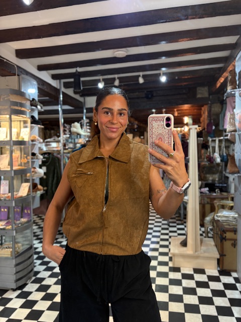 Lovely faux suede sleeveless zip jacket in a gorgeous tan colour. Perfect for layering.