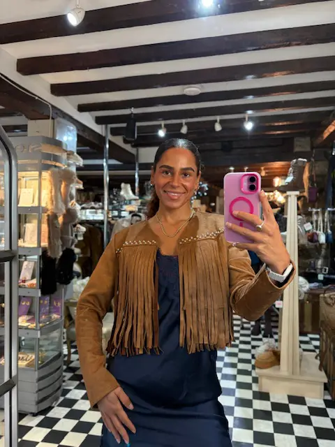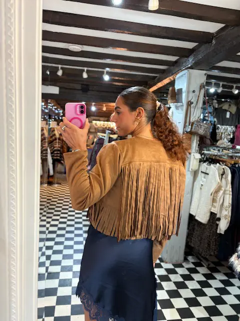 Super fun cropped tassel jacket. Faux suede in that gorgeous camel colour. Features fringing on the front and back. Perfect for layering for those autumnal outfits or wearing on its own in those summer months at festivals etc.