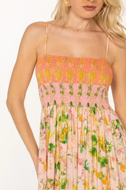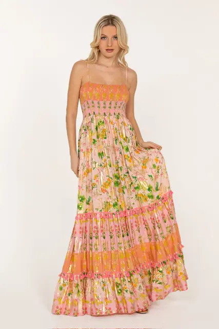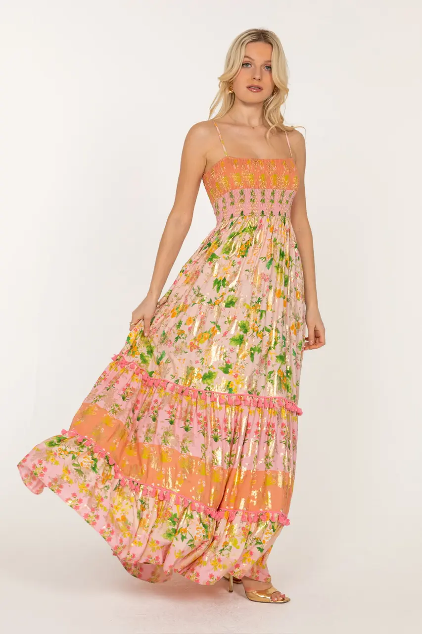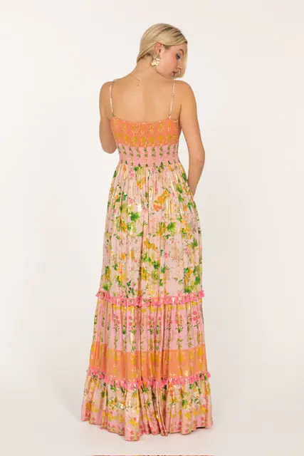 This maxi dress features a beautiful floral print with lots of fresh and fun summer colours, along with gold foil details and embroidered Pom poms along the hems. Adjustable straps to enable a good and secure fit.