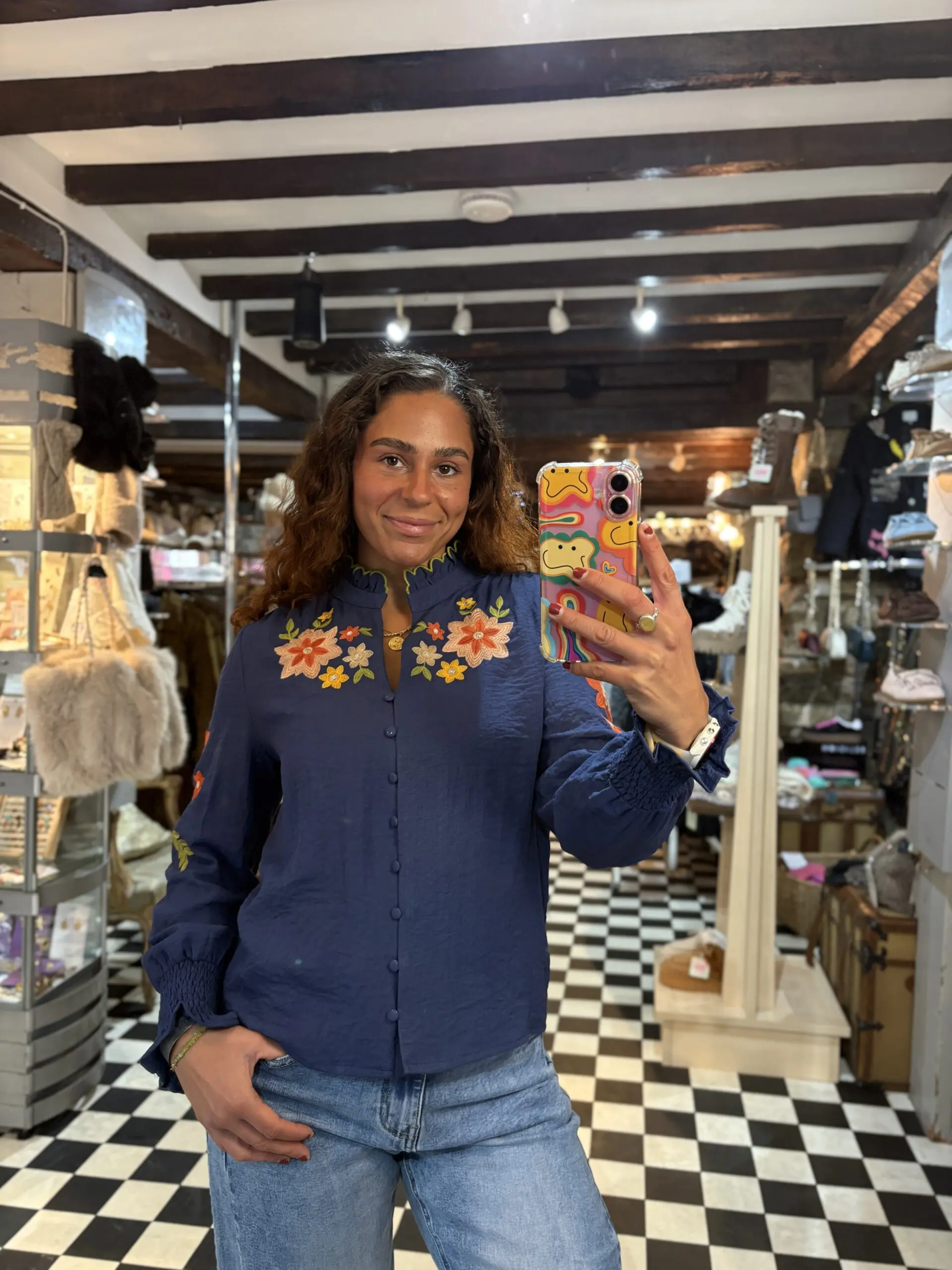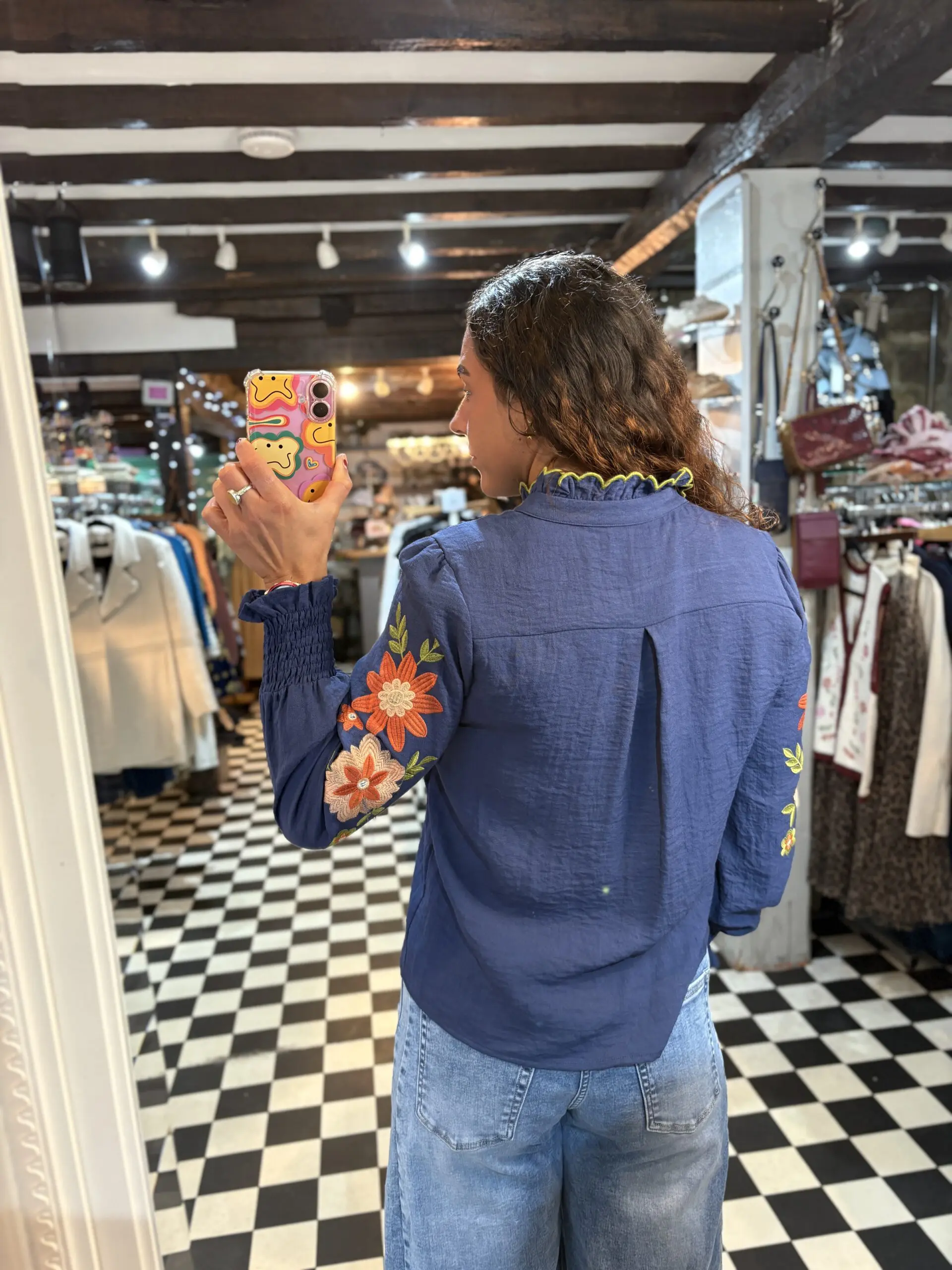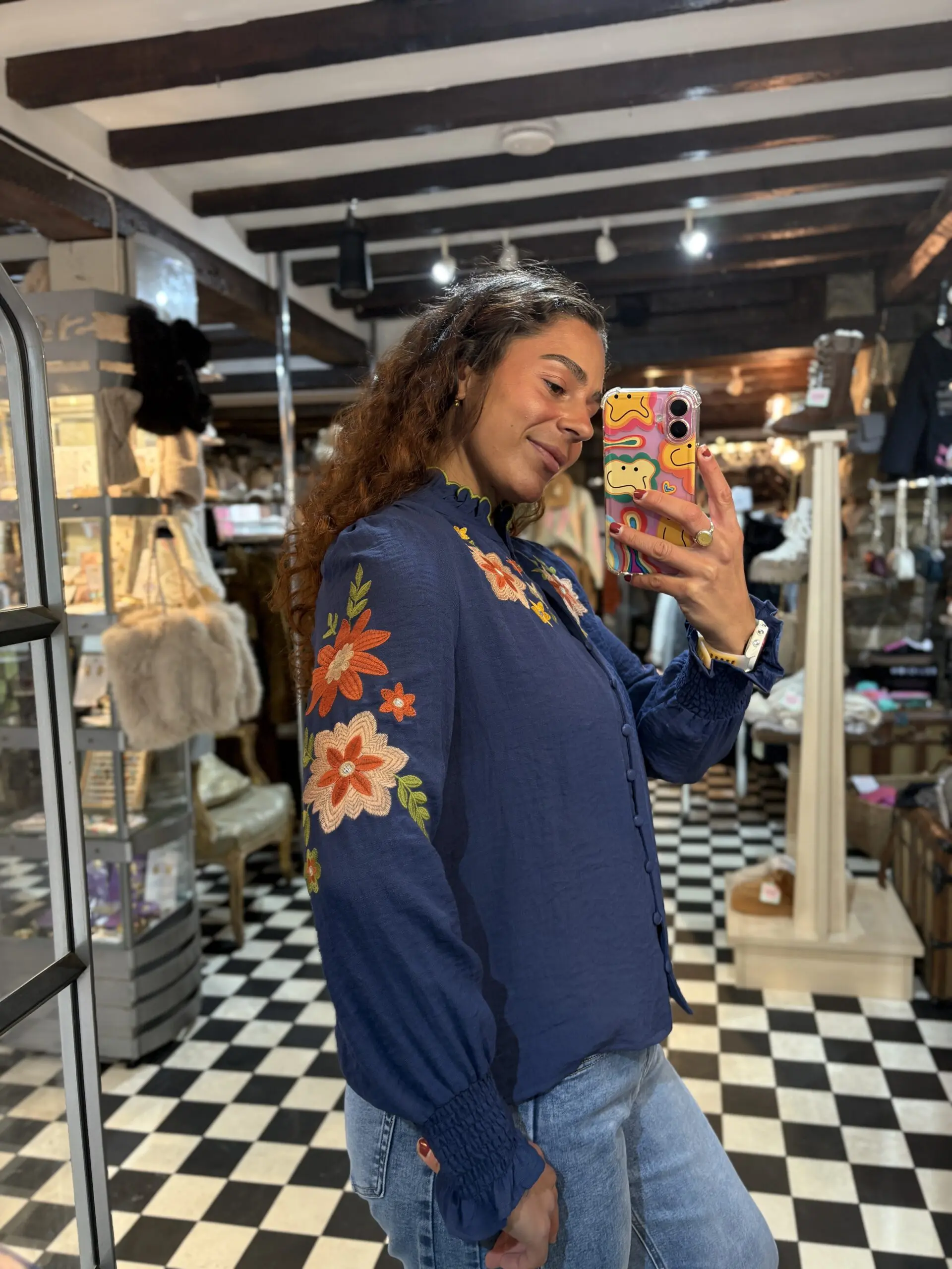 Beautiful blouse with floral embroidery on the neckline and sleeves.