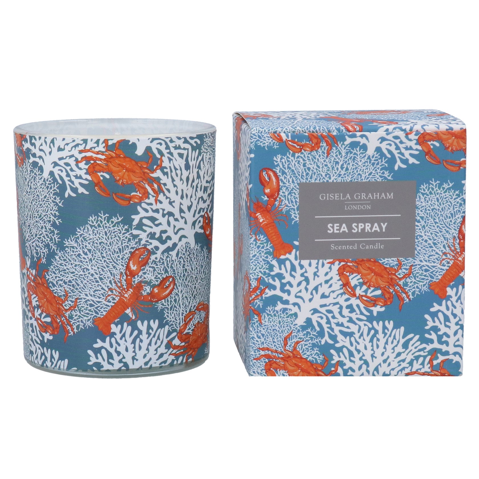 Coral and shellfish patterned boxed candle with a sea spray scent.