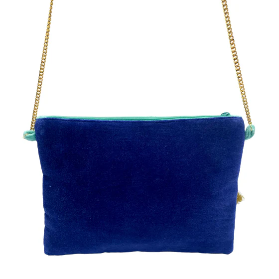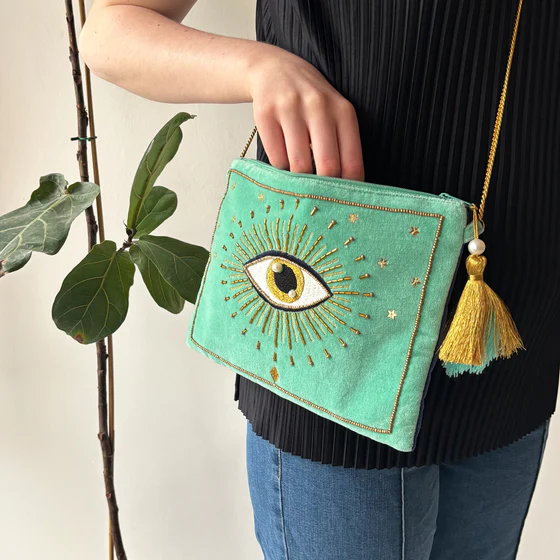 A luxurious, turquoise velvet clutch bag, featuring a beautifully embroidered mystical evil eye . It is carefully embellished with sequin stars, gold stitching and beads, finished with a gold beaded boarder.Comes complete with a luxurious gold & turquoise tassel with pearl bead and a long gold detachable metal chain handle & detachable velvet wrist strap