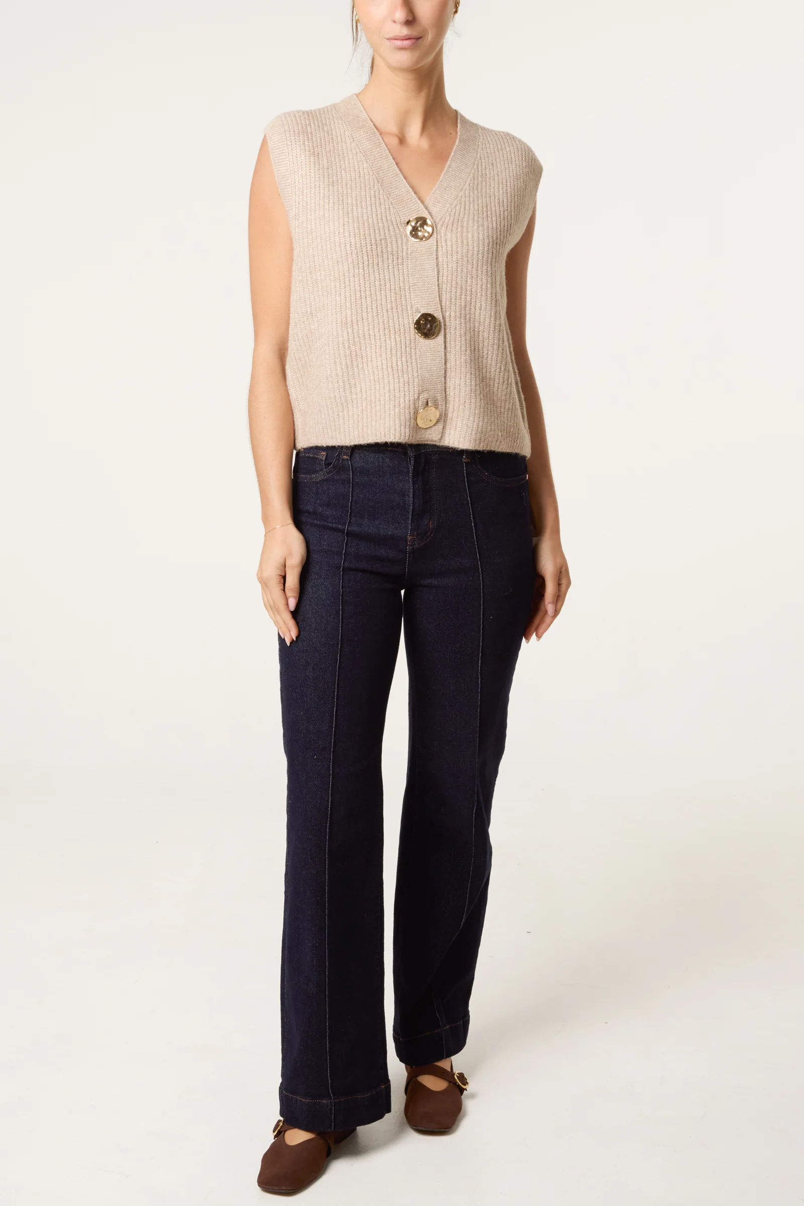 Lovely soft knit sweater vest / waistcoat perfect for layering or wearing on its own. Nice neutral beige colour with gold accent buttons.