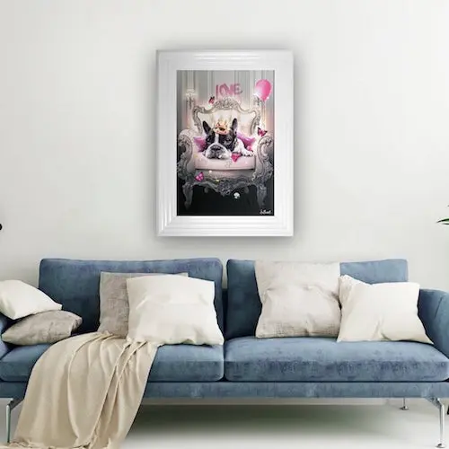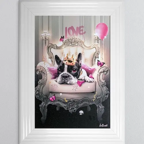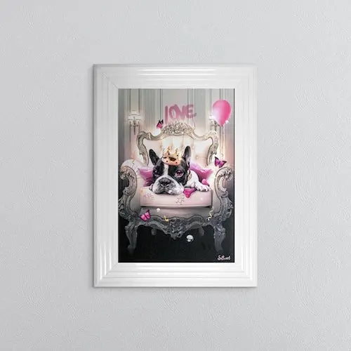 Do you love dogs? Is your dog the King or Queen of the house? Then this is made for your home! With a punk twist on a classic image this will add style and colour to your home. Finished in a high quality white crisp frame.
