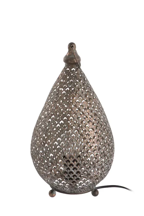 This hand finished metal lamp has a decorative design that will project warm lighting in beautiful patterns around rooms. Charming look with it’s vintage bronze style.