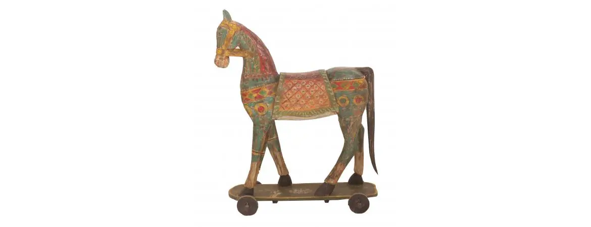 Introducing our hand painted decorative wooden vintage horse on wheels. Beautiful Orange and Green hand painted solid wood carved Horse Sculpture. Perfect to add colour to your lounge or child’s bedroom. Standing proudly on its four legs on a base with wheels, this antique carved horse has elegant posture and an ornate decor, that will make it a great decorative object.