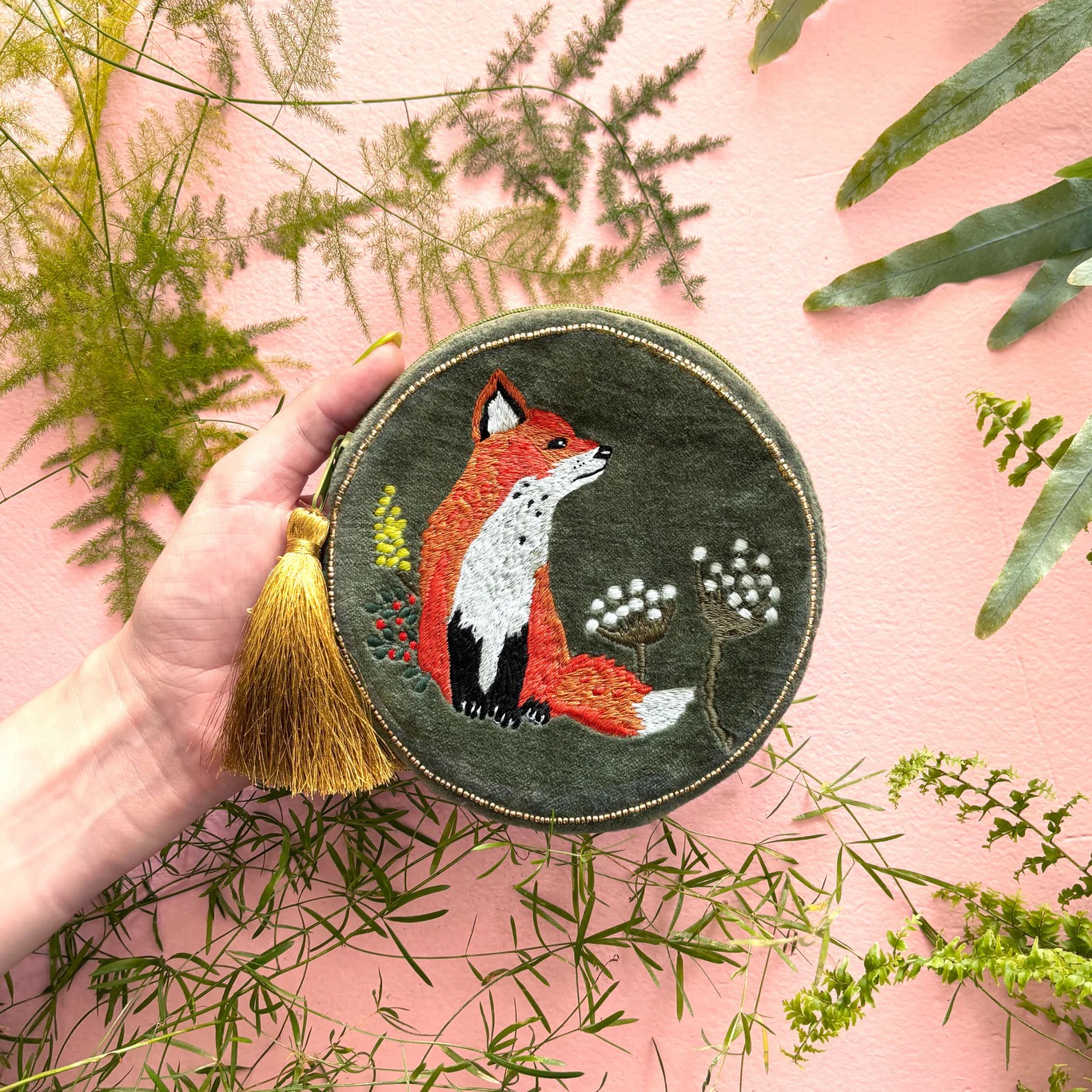 Features: Add a dash of woodland charm to your accessories with this delightful round fox purse from the Secret Garden collection. Made from rich forest green velvet with a lush green back, it features a beautifully embroidered fox nestled among leaves and floral details. Shimmering beadwork adds a touch of magic, while the gold tassel zip and soft cotton lining make it as practical as it is pretty. Perfect for makeup, jewellry, or bits and bobs-an autumnal treasure for fox lovers and forest wanderers.