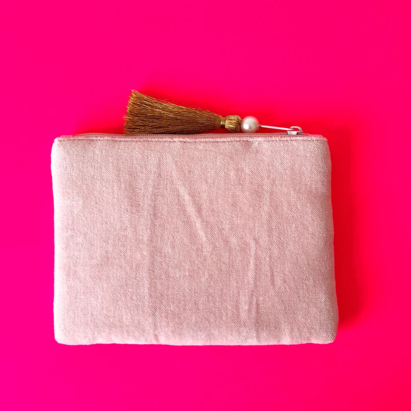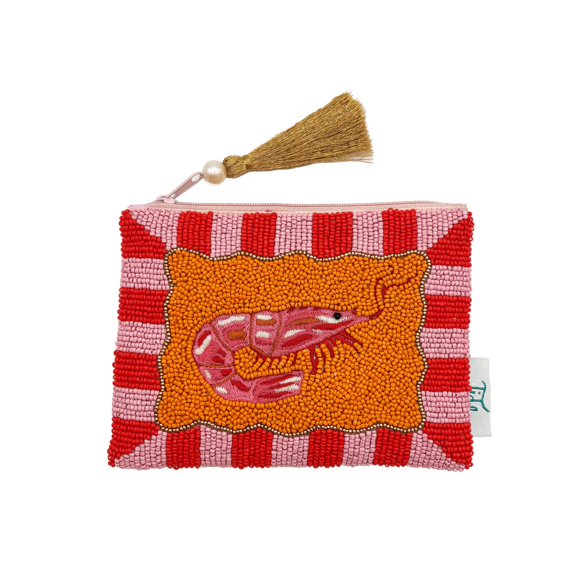 Features: Carefully crafted with intricate beadwork this colourful Purse features a beaded colourful boarder with an embroidered Prawn. This fully beaded pouch is just the right size for your lip balm, jewellery or cash while adding a touch of fun to your life. It is finished with a metallic woollen tassel with pearl bead. A soft pink velvet on the reverse. Perfect as a gift or for keeping your handbag organised. This is handcrafted, small variations make it pefectly yours.