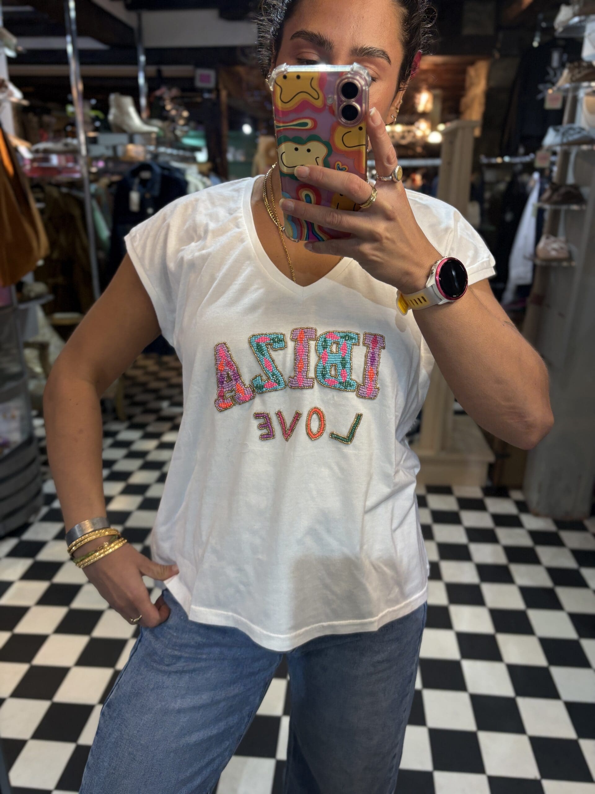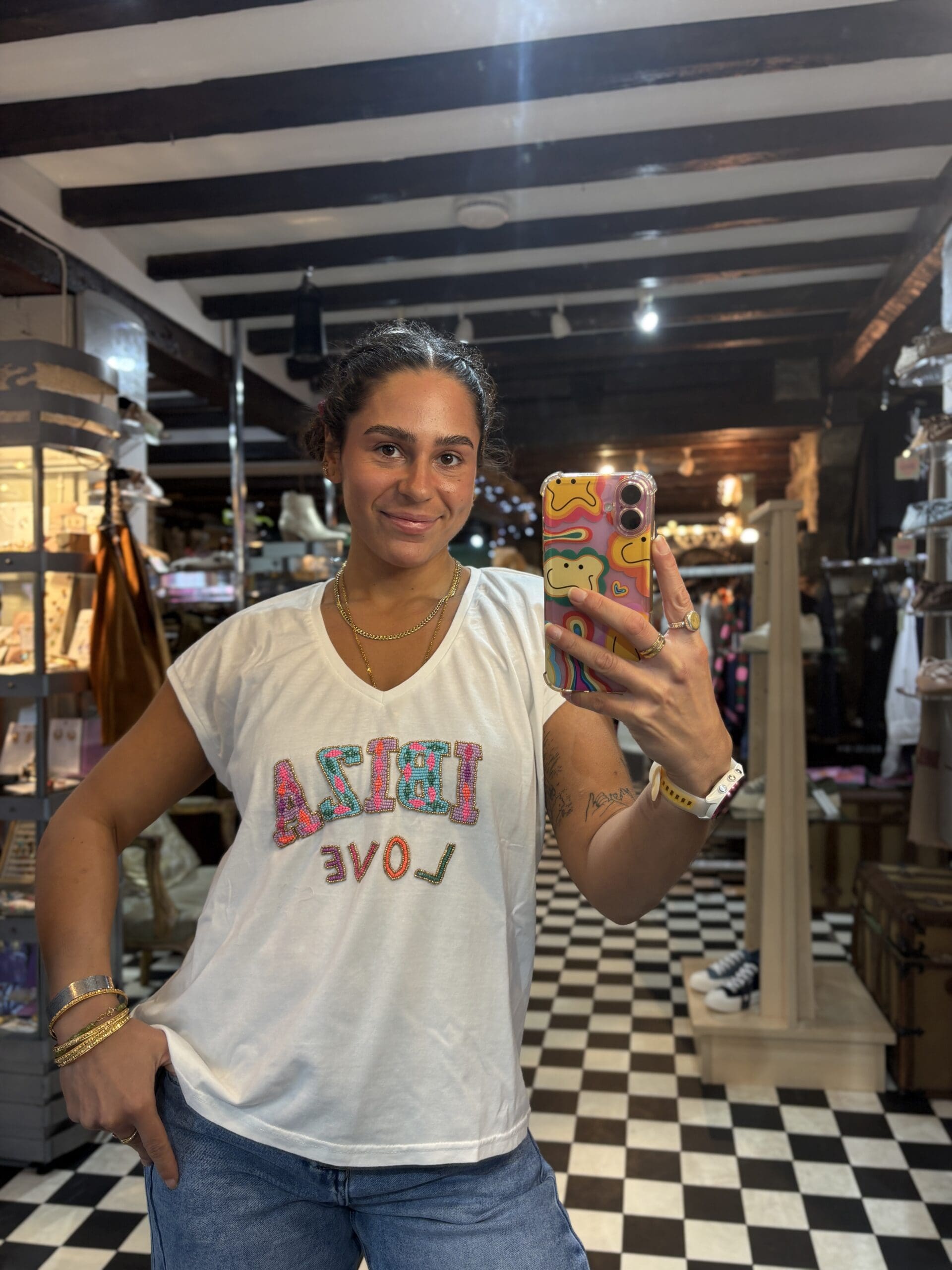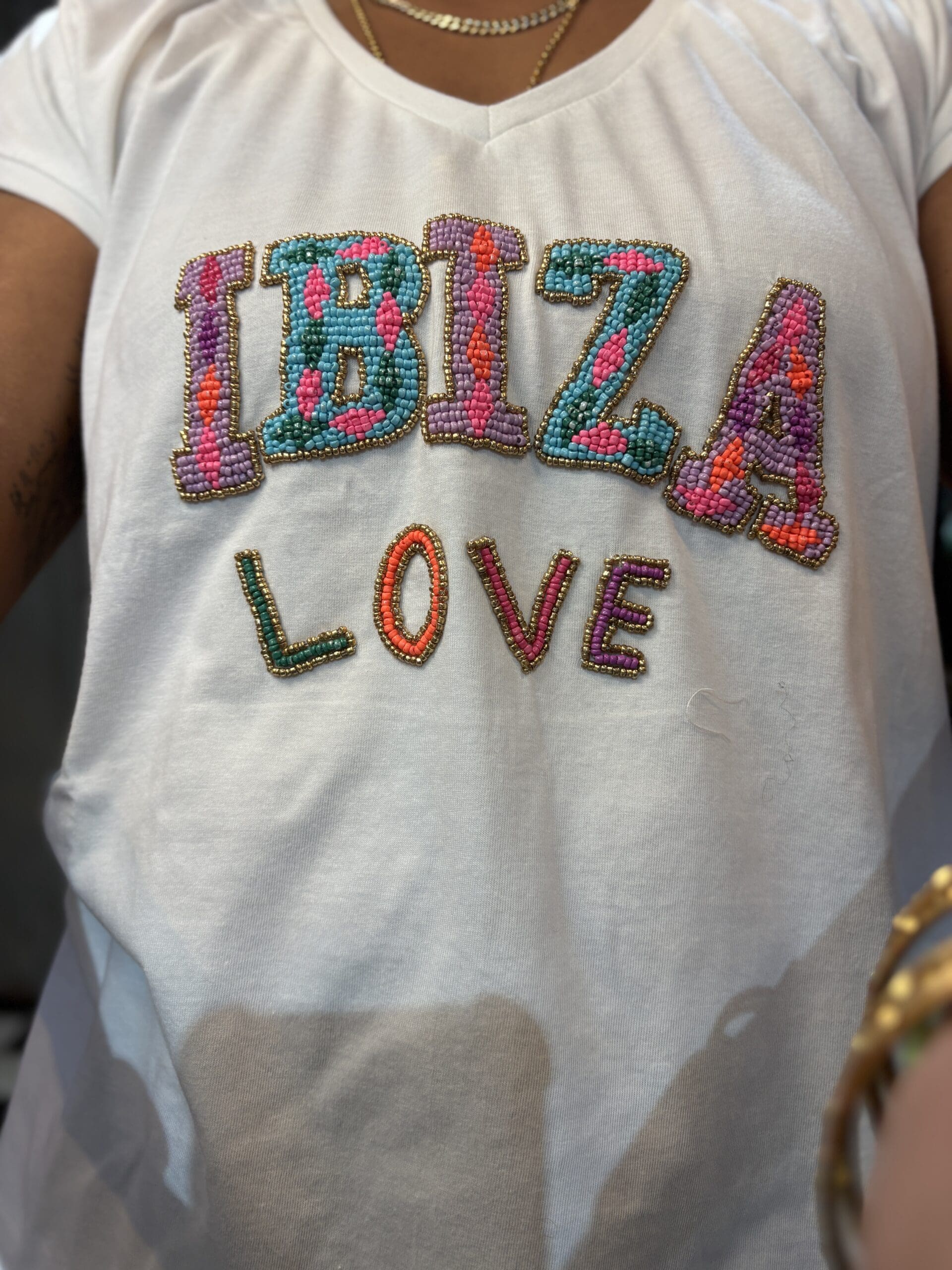 Beautifully beaded cotton t shirt with Ibiza slogan and a lovely mix of colours. Lightweight, comfortable and breathable style. Perfect for summer.