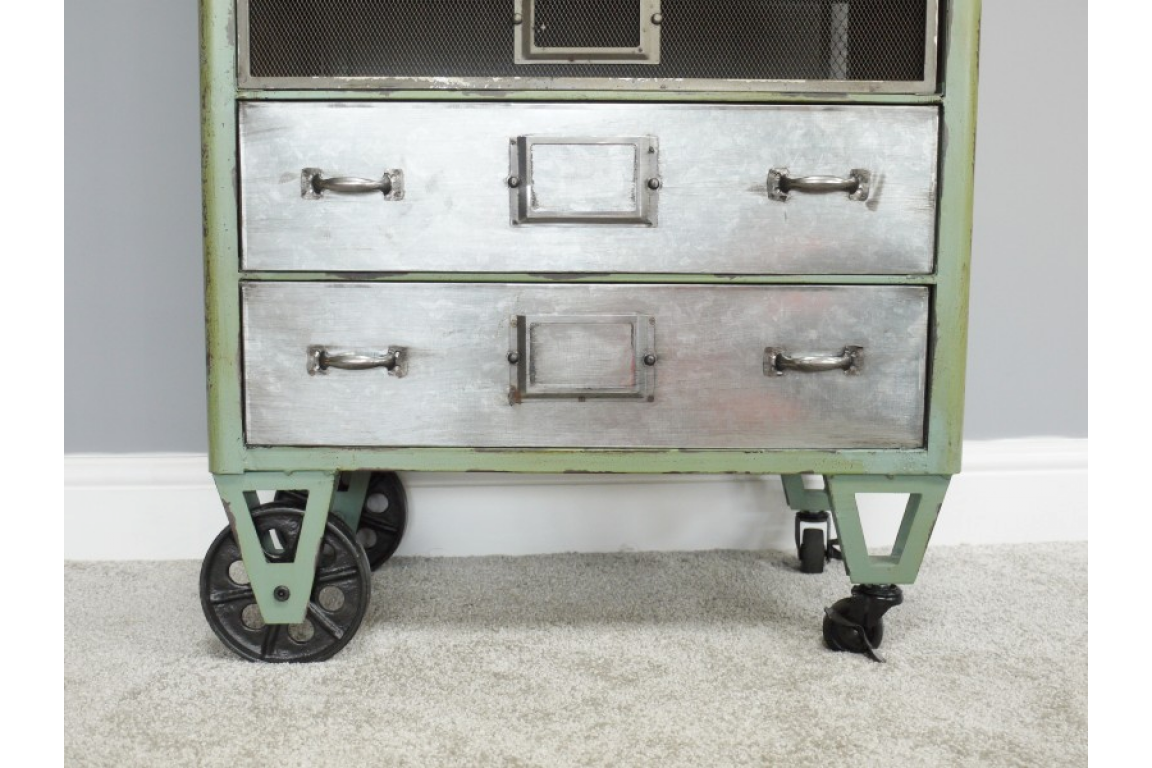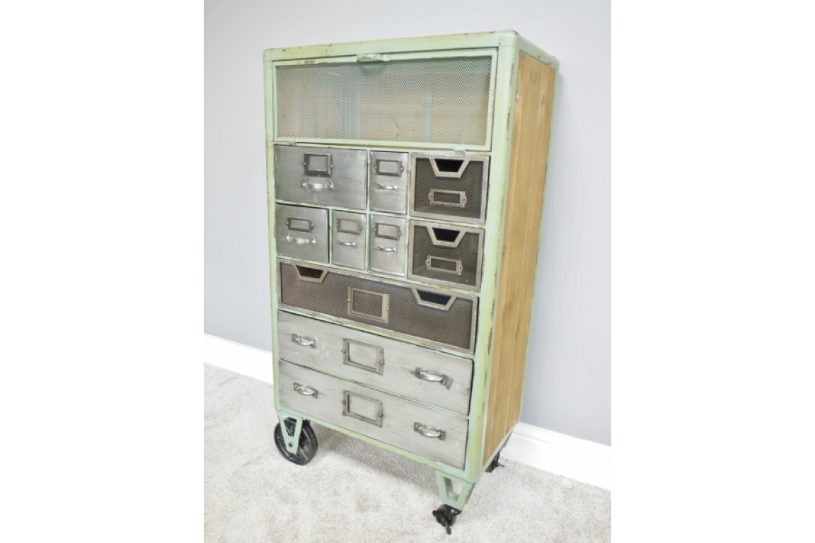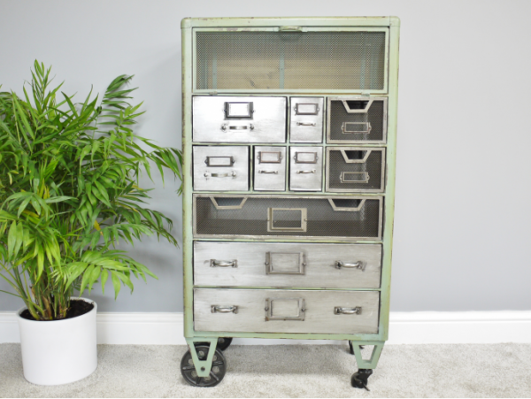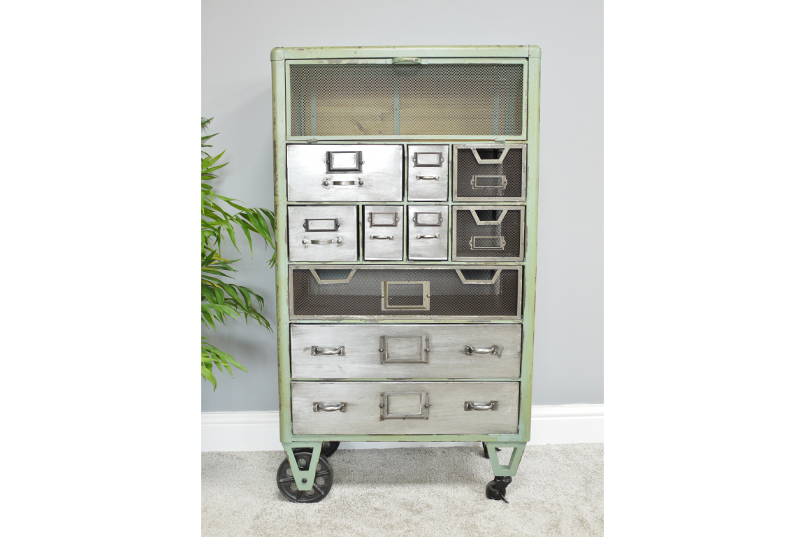 Give your home a pop of colour with this industrial cabinet in distressed french green. Sure to bring a contemporary and modern feel to any room. Set on wheels, this unique chest of drawers has 11 separate storage spaces, making it not only stylish but practical too. This statement piece will definitely impress.