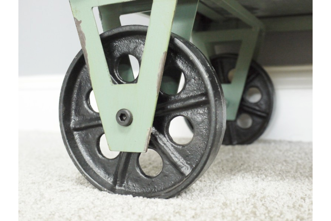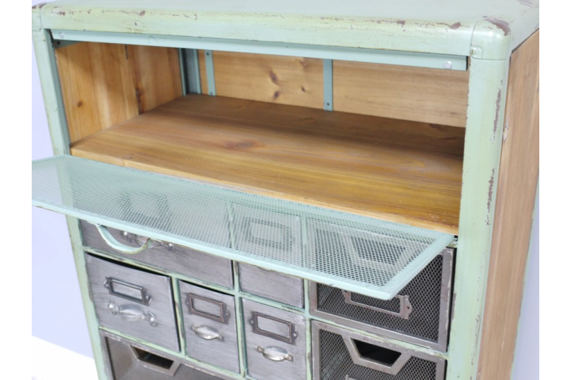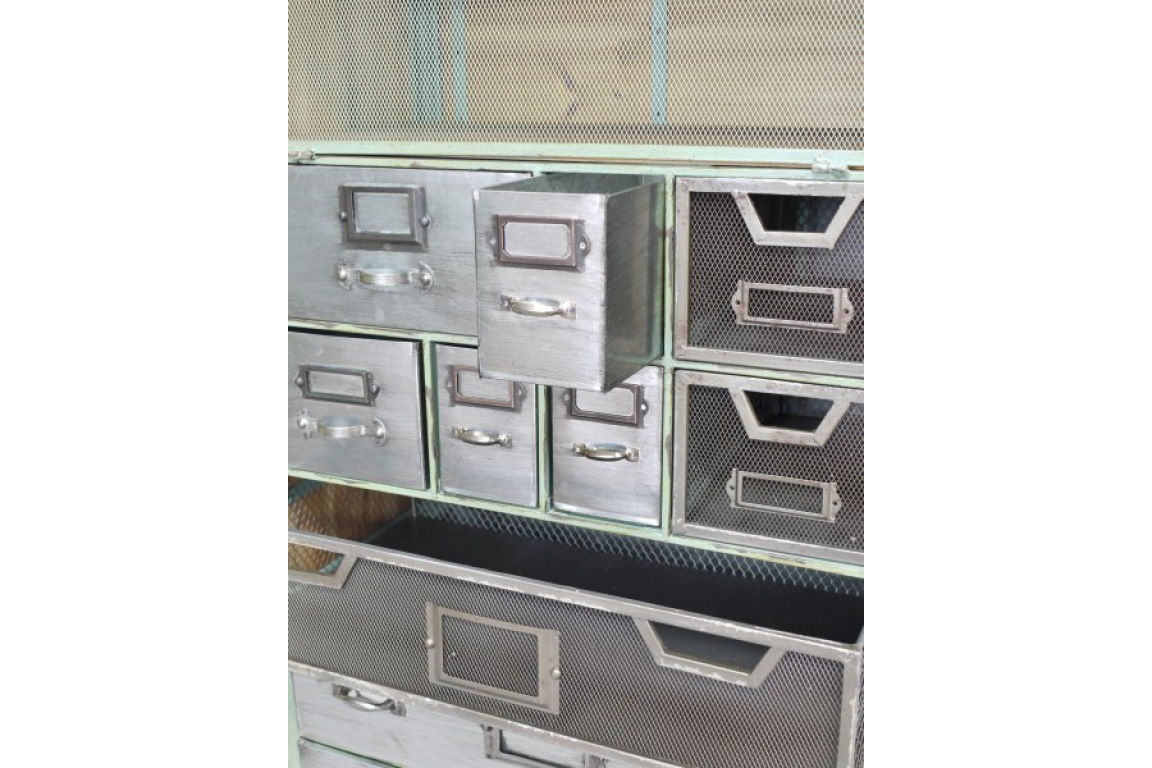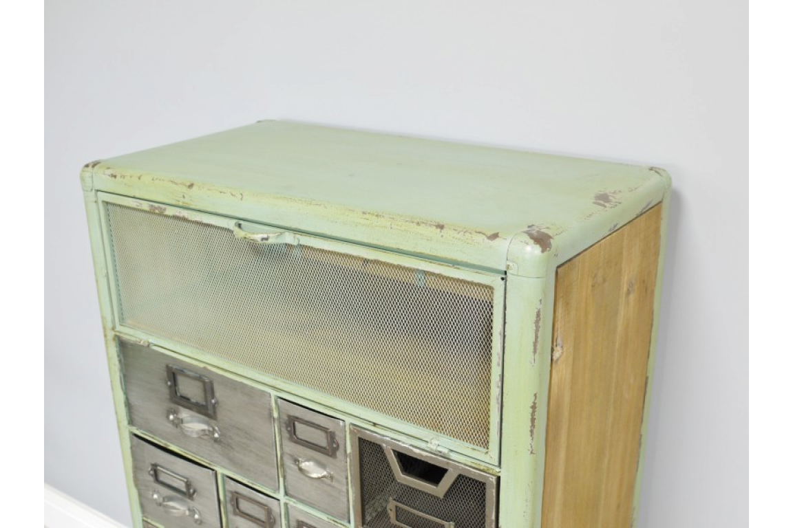 Give your home a pop of colour with this industrial cabinet in distressed french green. Sure to bring a contemporary and modern feel to any room. Set on wheels, this unique chest of drawers has 11 separate storage spaces, making it not only stylish but practical too. This statement piece will definitely impress.