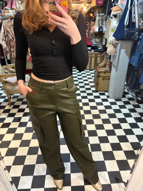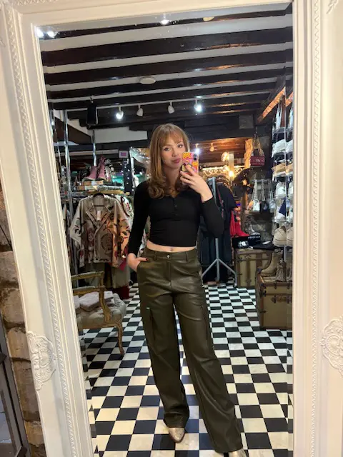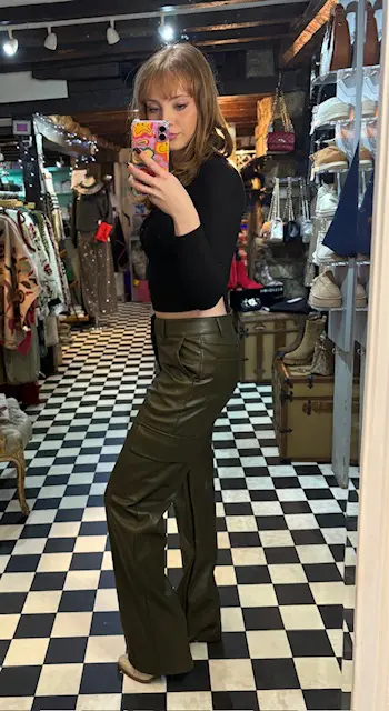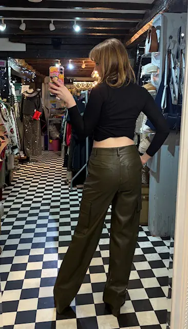Lovely and flattering wide leg on these faux leather look trousers. Can be dressed up or down.