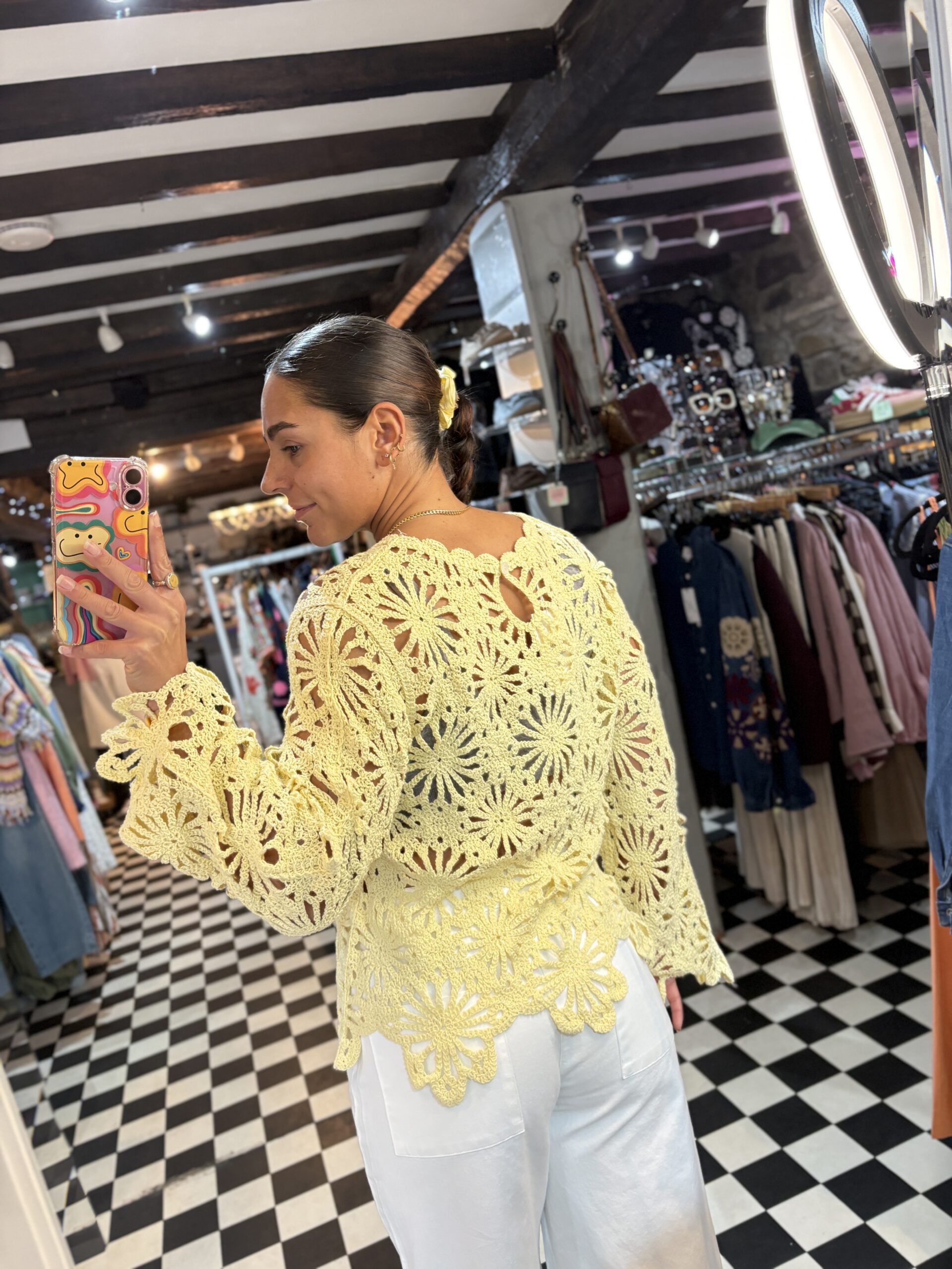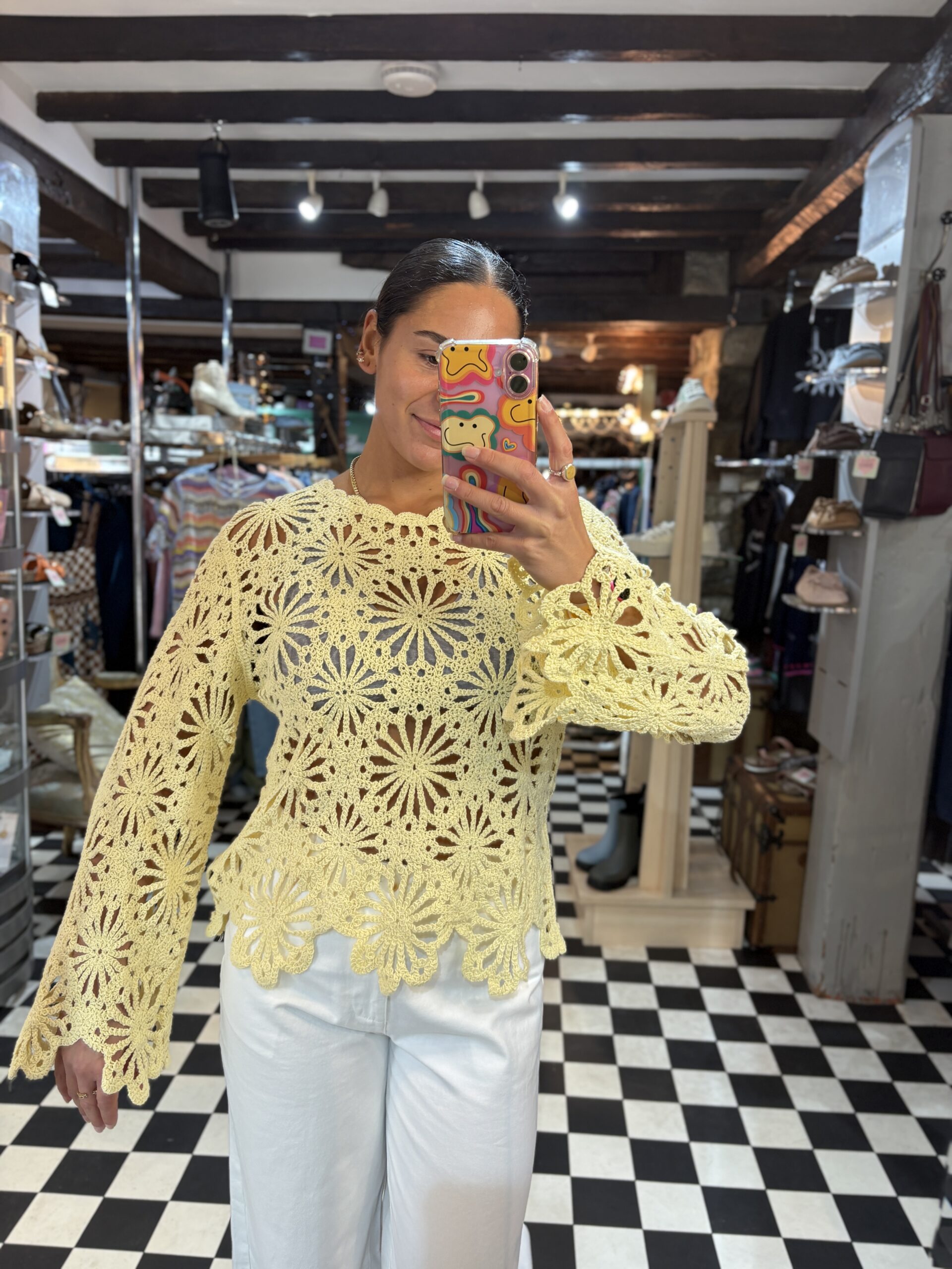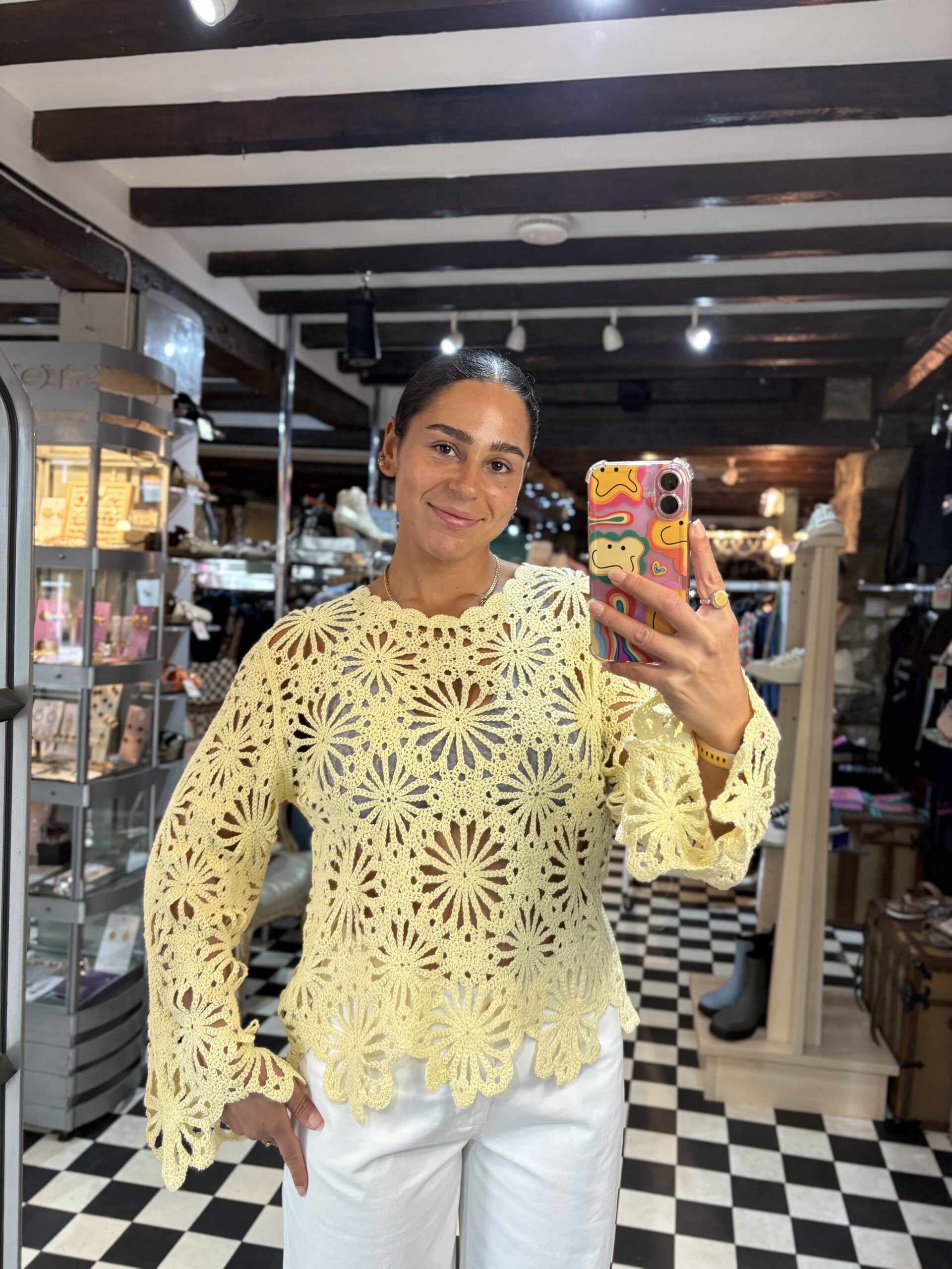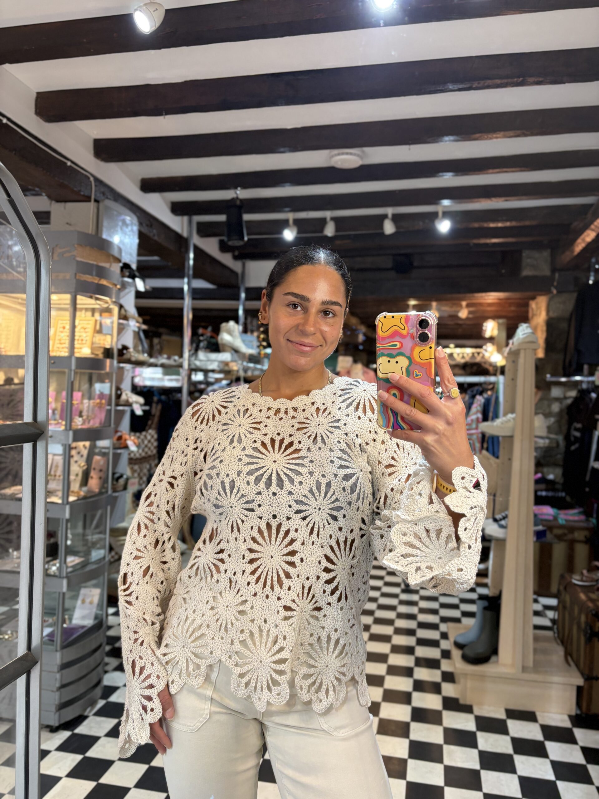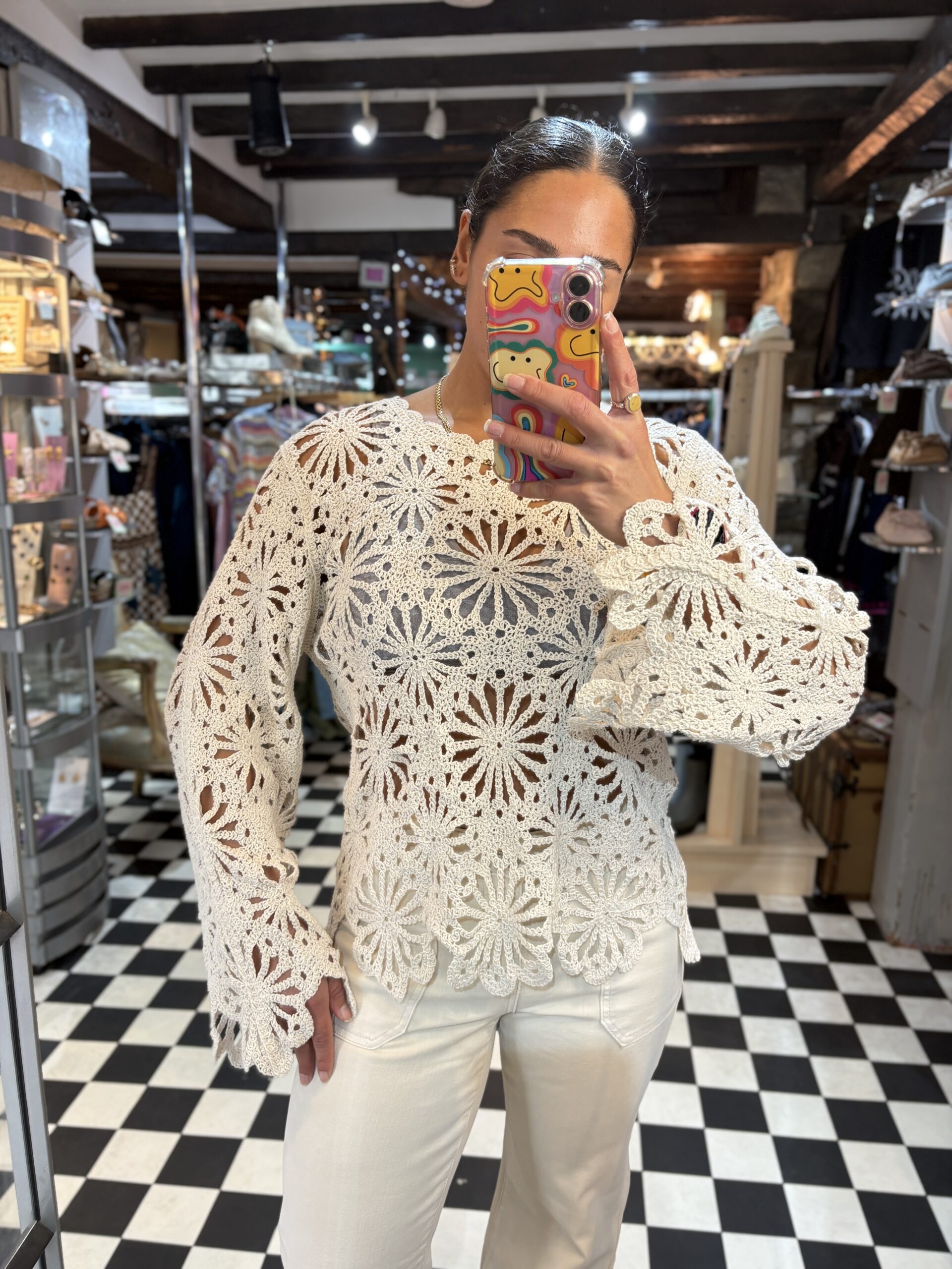 Beautiful new crochet tops with slightly flared sleeves create a nice shape. Look lovely layered or on their own. Can be dressed up or kept casual for those beach looks.