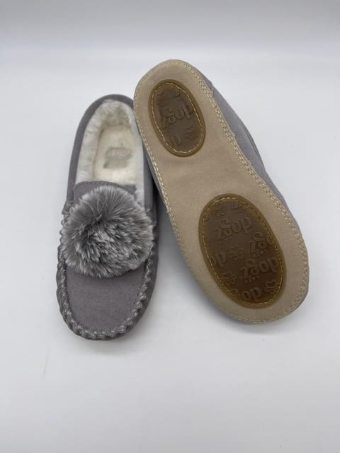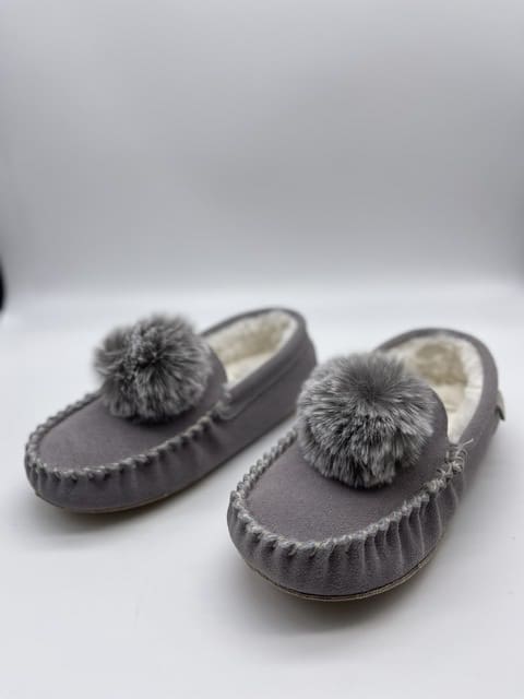 Get yourself a fantastic pair of grey moccasin slippers with complimenting grey fluffy pompom on the upper.