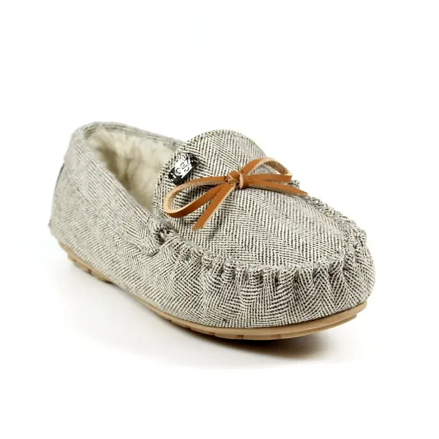 Introducing the stylish and cozy Jennings Beige Slipper, featuring a luxurious herringbone design upper made from soft textile. The faux fur lining provides extra warmth and comfort, while the slip-on design allows for easy on-and-off wear. The memory foam insole ensures a cushioned step every time. Finished with a chic leather knot bow detail and Lazy Dogz branded tag, these slippers are the perfect addition to any loungewear collection.