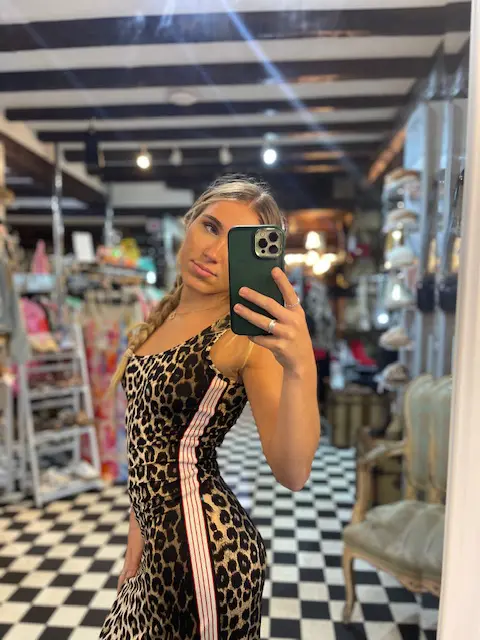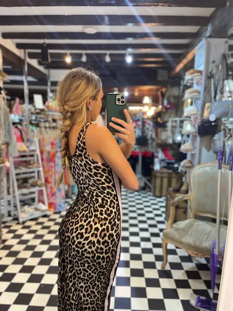 This dress gives a very sport luxe feel with its racer stripe down each side. Very flattering and slim body con style fit. very cutesy, very on trend with is leopard print pattern. Looks good with trainers, heels or boots. It can be dressed up or down and also layered with jumpers or tops.