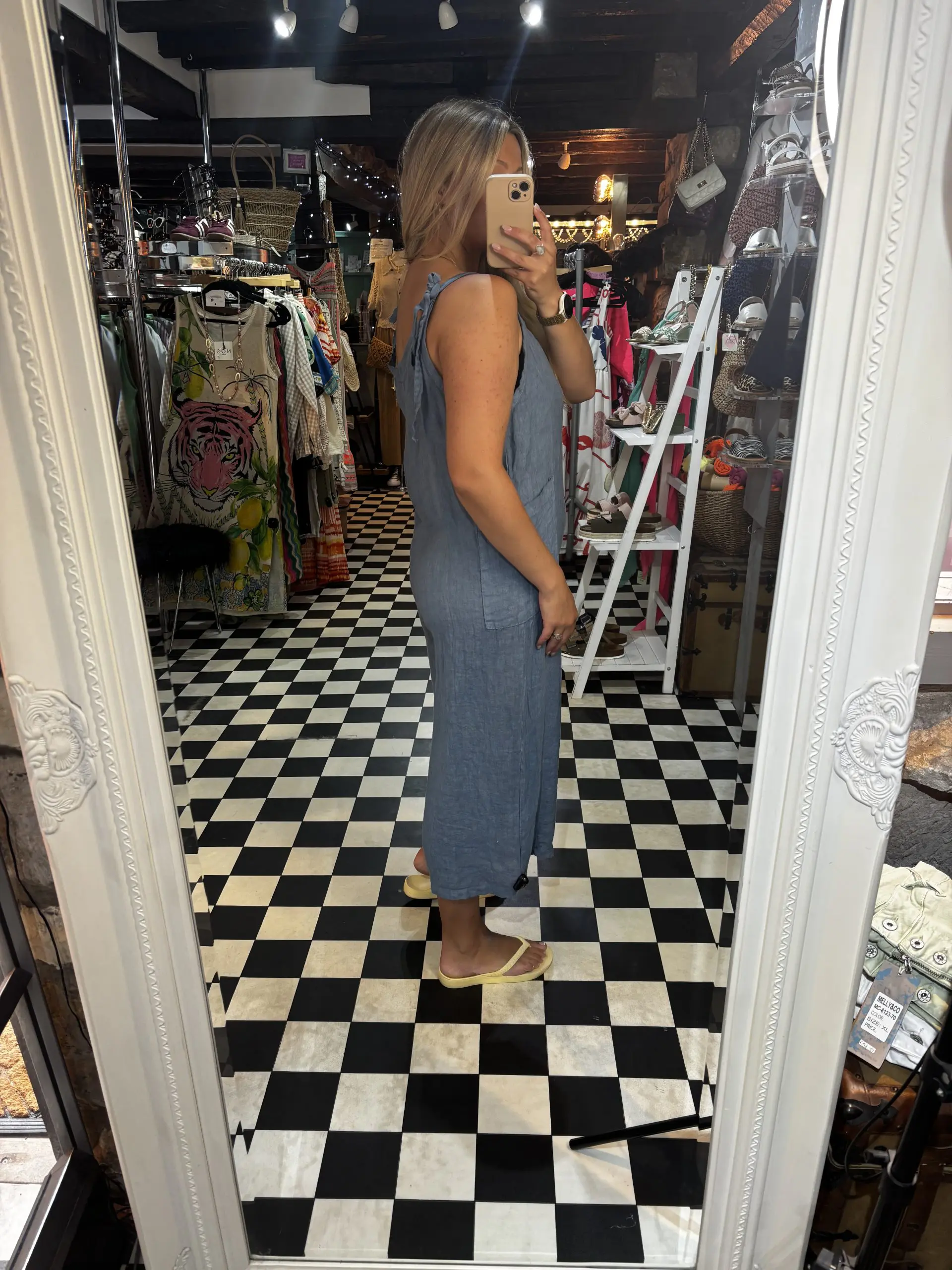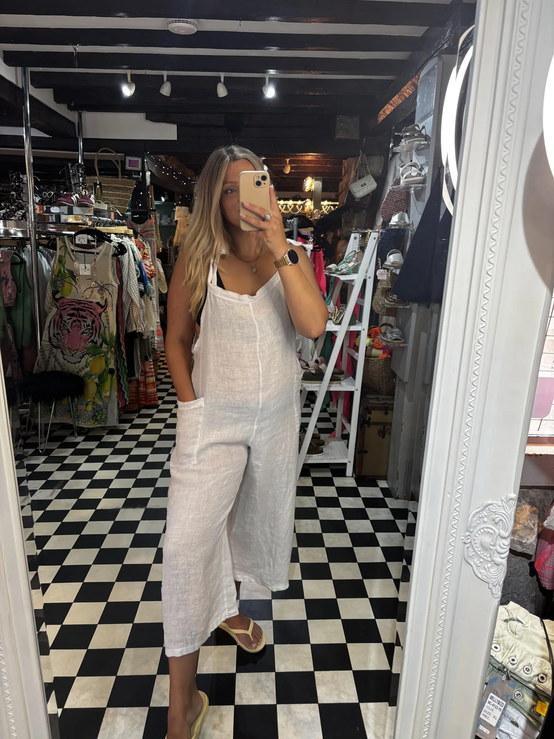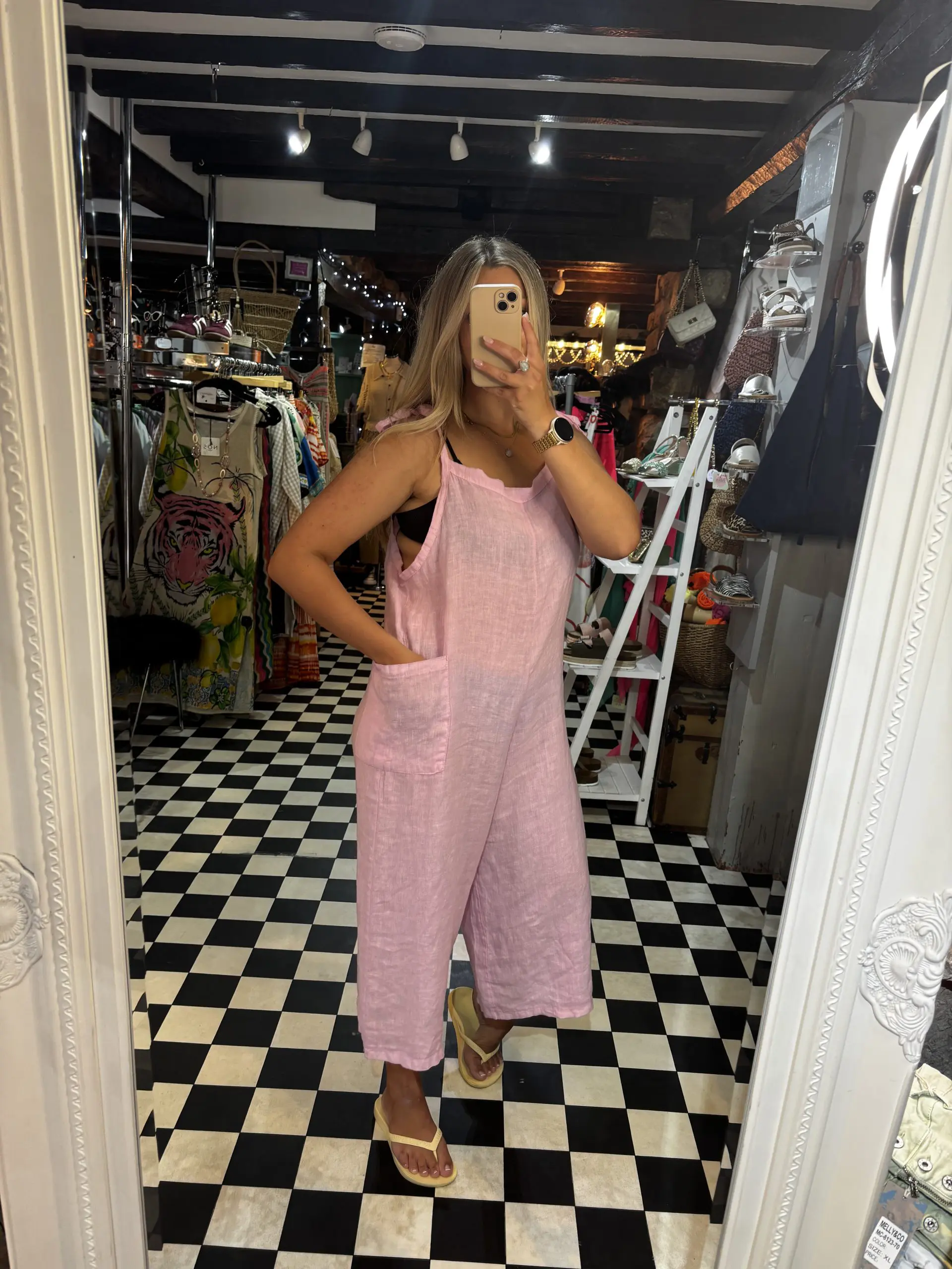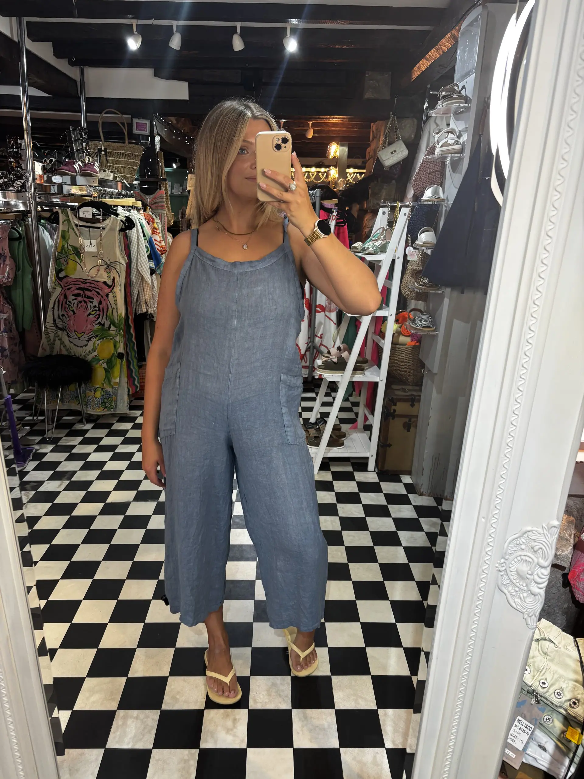 Chic, effortless and classic! A linen jumpsuit is a must have for your wardrobe. They are lightweight and easy to style. Tie up straps and a cropped leg fit. One Size.