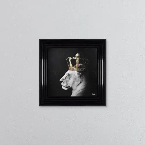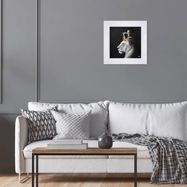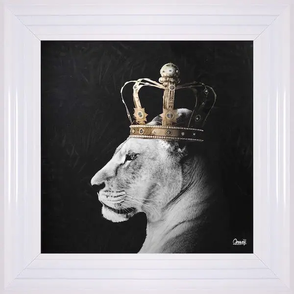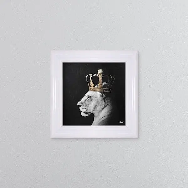 This stunning print of lioness with gold crown, is reproduced and mounted under glass, the glass embellished with hand applied liquid art. Available in white or black frame.