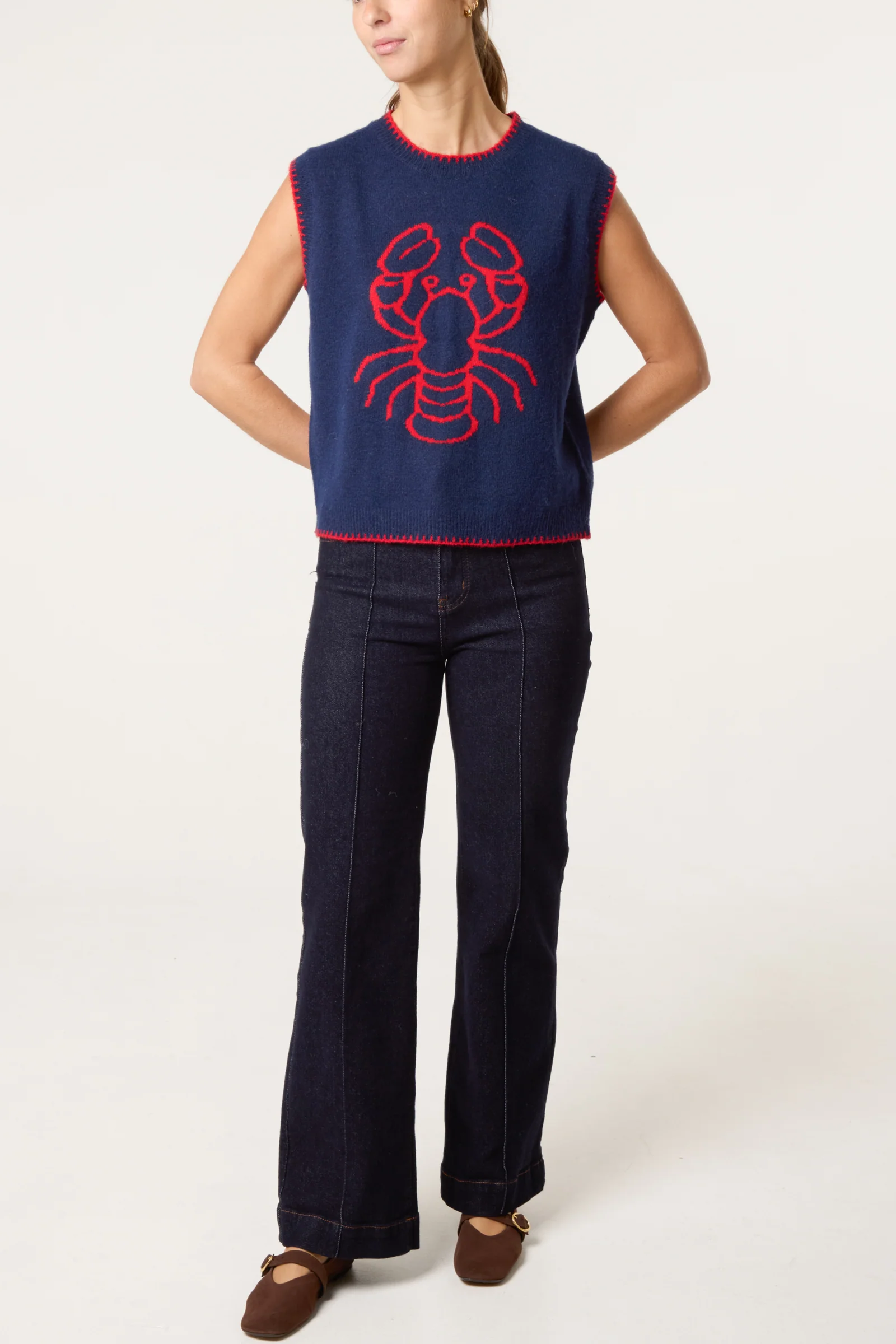 Super cute lobster detail soft knit sweater vest top features a contrasting stitch hem in a lovely navy and red colour. Can be layered or worn on its own.