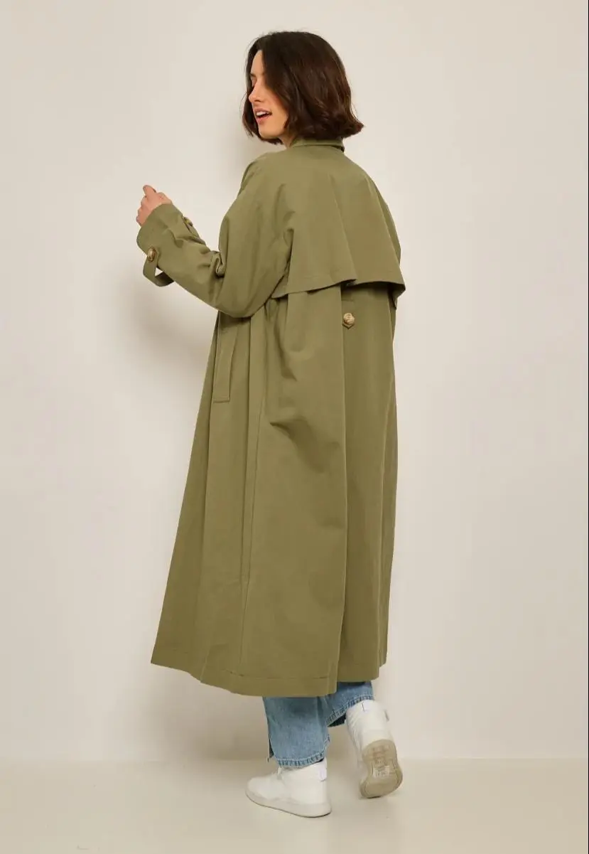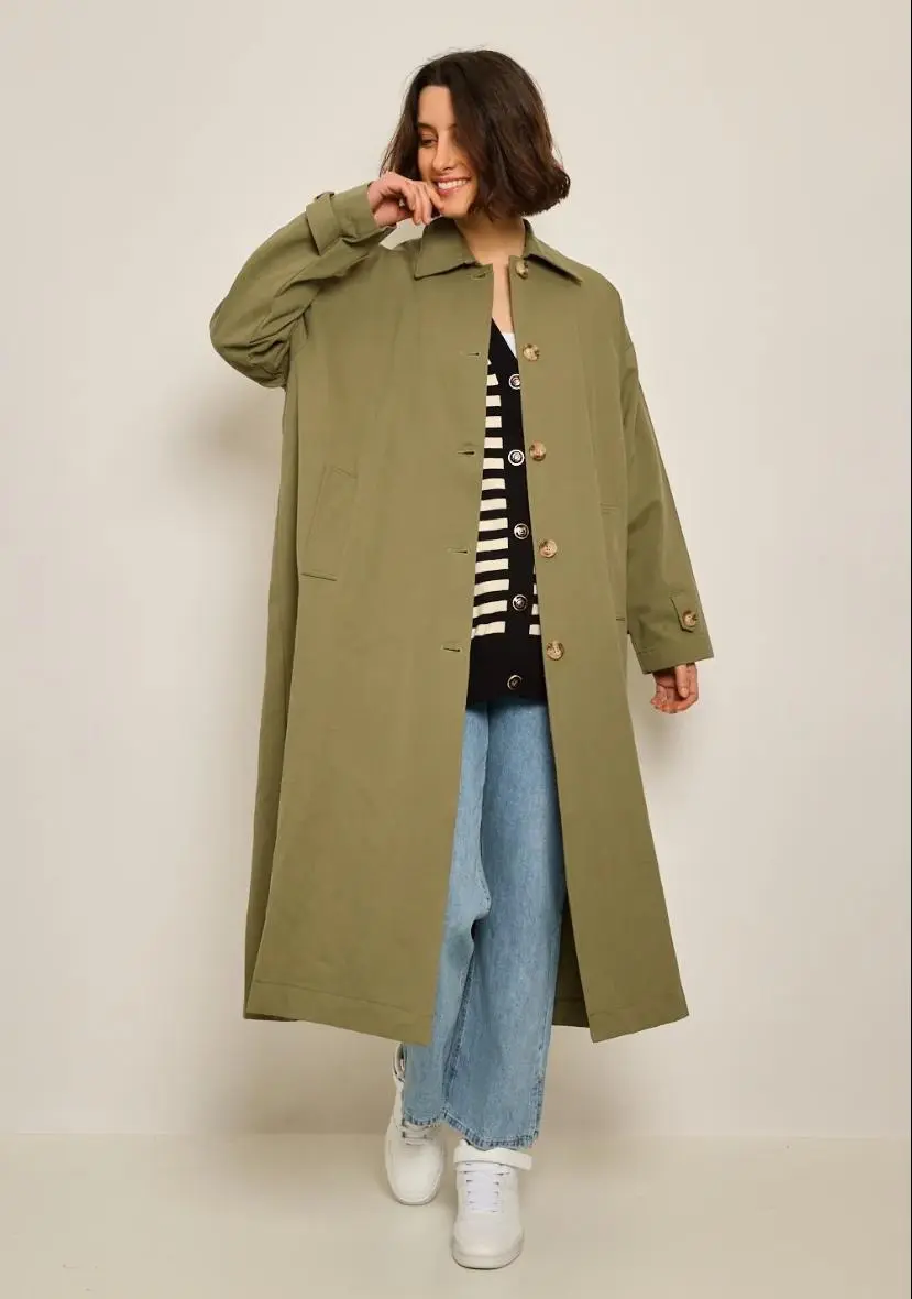 This beautiful, long and slightly trench style coat is perfectly transitional. Not too thick, not too thin it can be layered up and yet wearable right through to our British spring time. Lovely long length for extra coverage. This jacket looks smart and chic , helping to elevate your look. It can be dressed up or down. Oversize style.